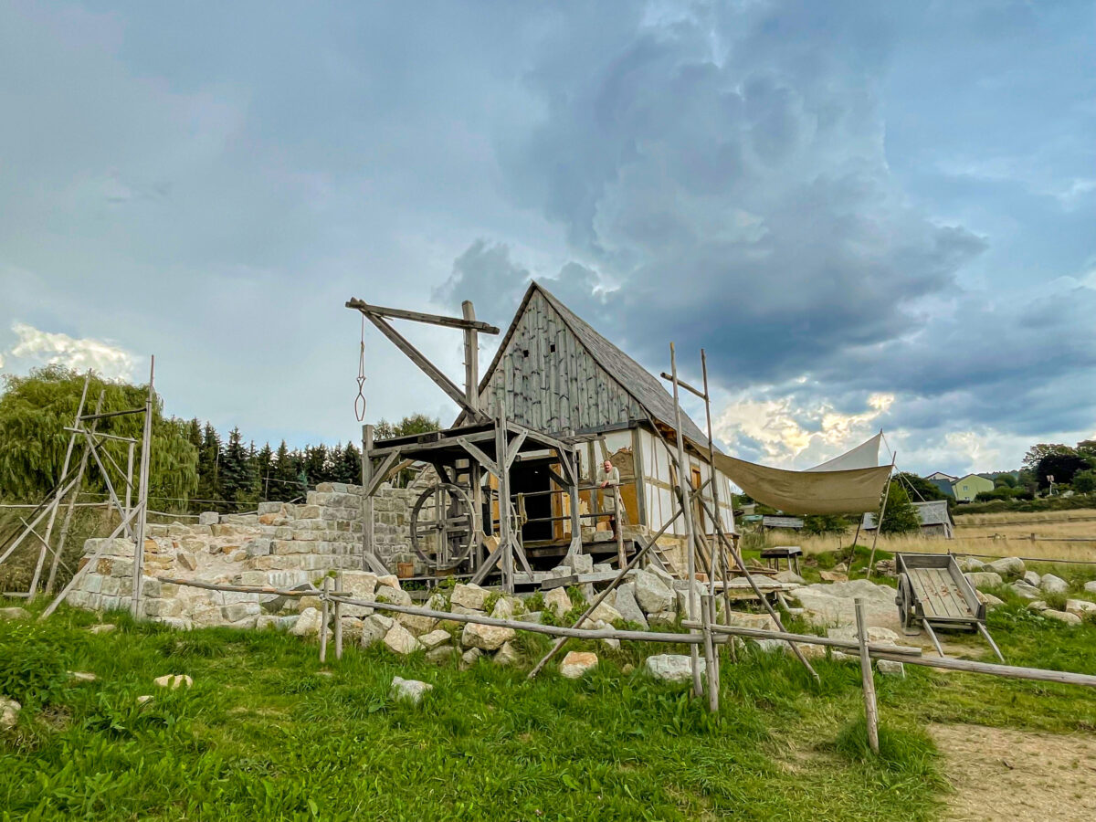 Ein weiteres Highlight des Rundgangs war die Erläuterung zum Bau der mittelalterlichen Reisestation von Kaiser Karl IV. Direkt an der Goldenen Straße gelegen, stellt diese Baustelle mit einem prächtigen Palas, zwei Fachwerkhäusern, einem Torhaus, einer Kapelle und einer Wehrmauer die zweitgrößte Mittelalterbaustelle Europas dar. Mit dieser 1500 Quadratmeter großen Reisestation öffnet der Geschichtspark ein neues Zeitfenster, der Beginn des steinernen Spätmittelalters.