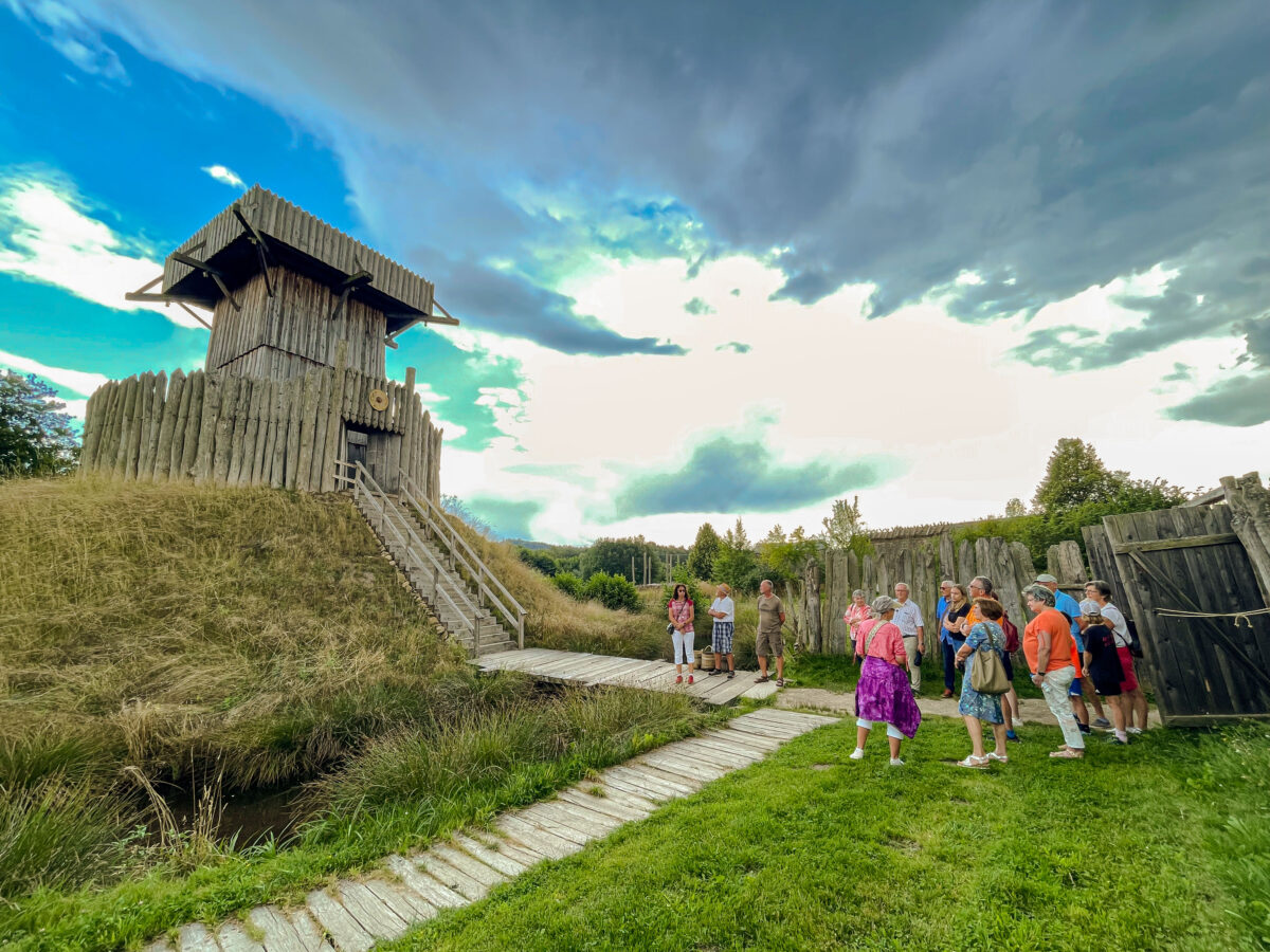 Unterteilt in zwei Gruppen wurden die Gäste von erfahrenen Führerinnen durch die Anlage begleitet. Dort bekamen sie detaillierte Informationen über das archäologische Freilandmuseum, das zu einer eindrucksvollen Zeitreise in den Alltag des 9. bis 13. Jahrhunderts einlädt. Während des Rundgangs durchstreiften die Besucher ein slawisches Dorf aus dem Frühmittelalter, erklommen die Turmhügelburg aus dem 11. Jahrhundert und betraten schließlich eine hochmittelalterliche Siedlung.