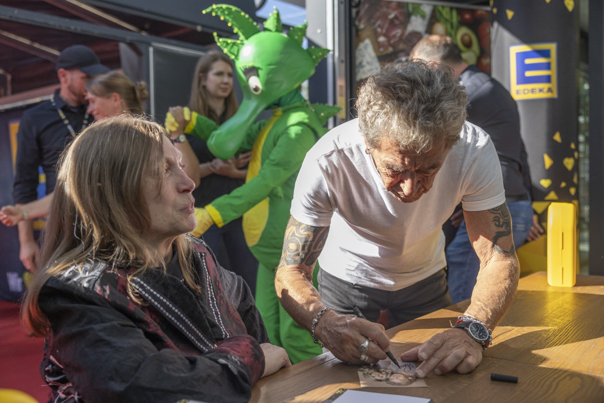 Der Musiker ließ sich, cool wie man in aus dem Fernsehen kennt, nicht aus der Ruhe bringen. Nachdem er sich in das Goldene Buch der Stadt Tirschenreuth eingetragen hatte, nahm er sich über drei Stunden für seine Fans Zeit. Auch seine Partnerin, Hendrikje Balsmeyer, die Illustratorin Joëlle Tourlonias und der kleine grüne Drache „Tabaluga“ waren mit an Bord, um den Besucher ein Lächeln ins Gesicht zu zaubern.