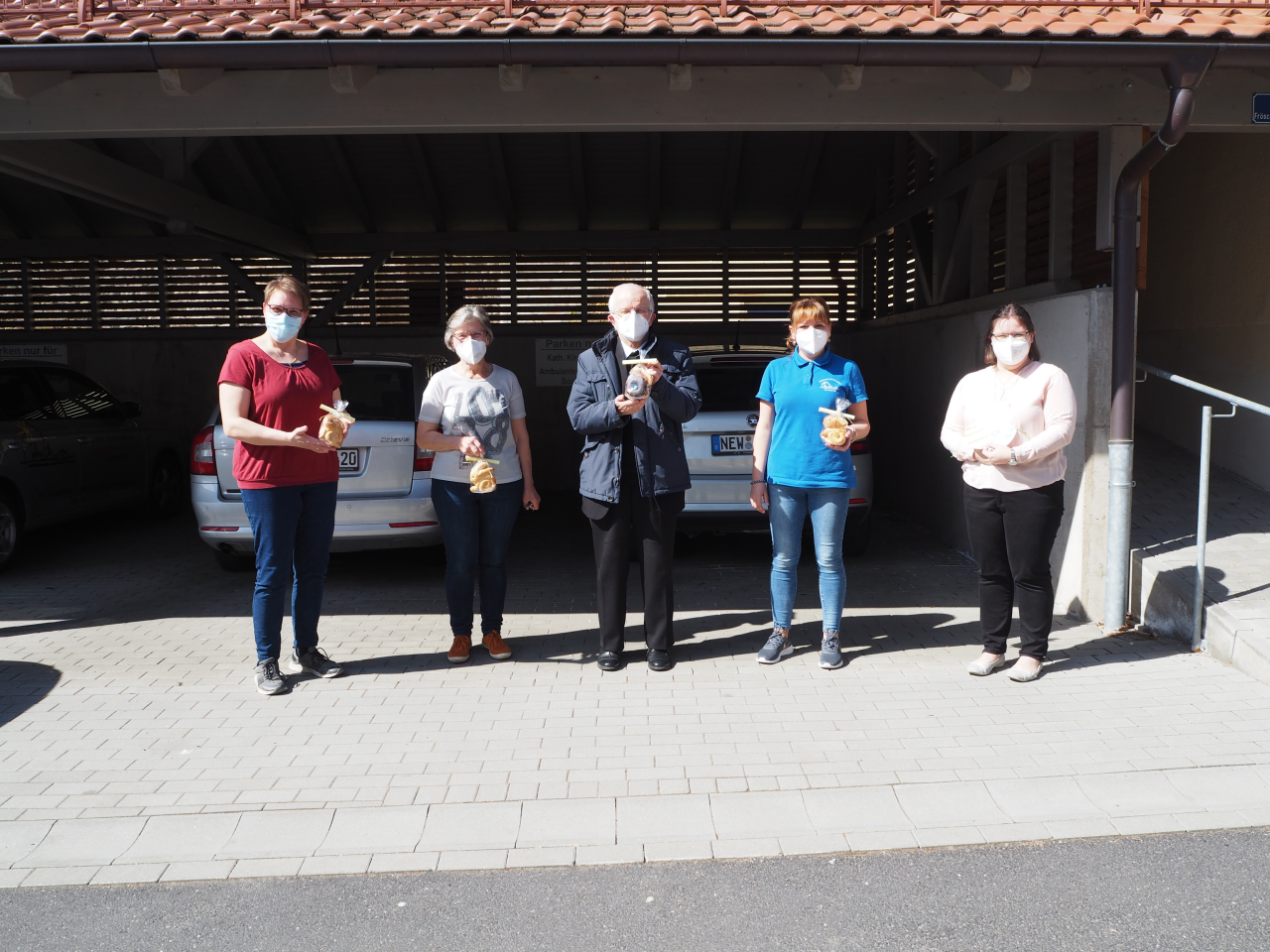 Bei der Bäckerei Arnold wurden 200 Osterhasen und Donuts bestellt. Zusammen mit einem Brief, der einen Ostergruß der Pfarreiengemeinschaft enthält, einem gebastelten Osterei und der Ostergeschichte wurden bereits die Senioren des Caritas-Seniorenheimes überrascht. Und nun werden durch die ambulante Krankenpflege die Menschen überrascht, die in dieser Corona-Zeit vielleicht besonders hinten anstehen.