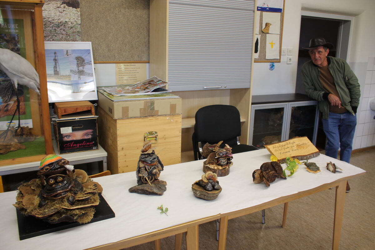 „Den suche ich ja schon seit Jahren!“ Eine Überraschung hielt der Tag ihrer Pilzausstellung in Burkhardsreuth für Martina Franke bereit: Der Künstler Eduard Fried, der ebenfalls im Schulhaus des Kirchdorfes seine Kunstwerke aus präparierten Baumpilzen zeigte, hatte bei einem Rundgang durch den Ortskern einen kleinen Pilz entdeckt, den die erfahrene Pilz- und Kräuterfachfrau aus Schwarzenbach erstaunt als Schwarzblauenden Röhrling identifizierte.