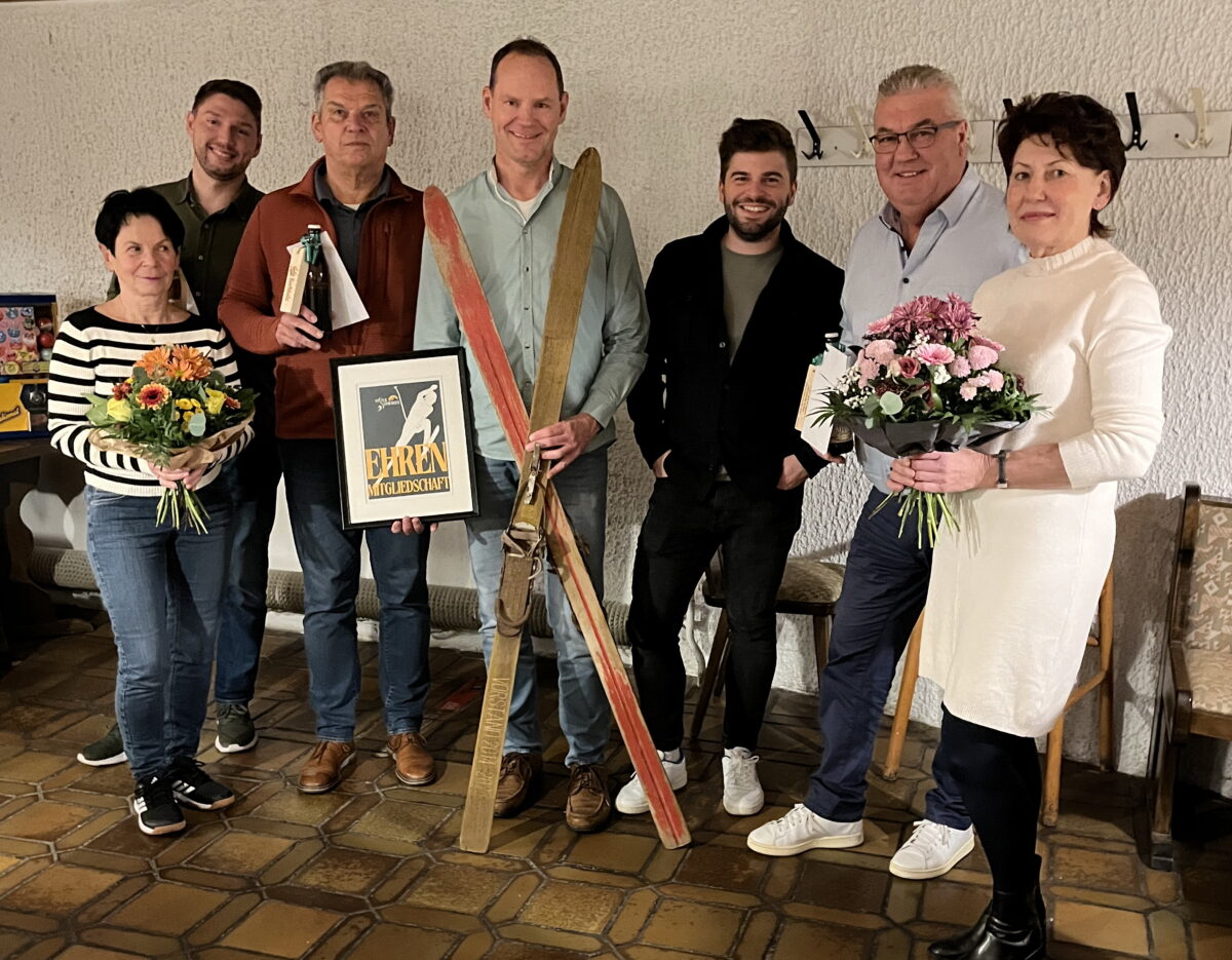 Der neue Vorsitzende Maxi Hammermann, bekannte dass er in riesige Skistiefel seines Vorgängers steige. Er dankte Harald Friedrich für die 14jährige Vereinsführung und seine Aktivitäten. Auf einstimmigen Beschluss wurde Harald Friedrich zum Ehrenmitglied der Pistenschwinger ernannt. Hölzerne Skier mit Inschrift, ein Fotobuch und der Gutschein für eine Liftkarte waren die Abschiedsgeschenke. Gemeinsam nahmen Hammermann und Friedrich die Verabschiedung weiterer Vorstandsmitglieder vor. Urgesteine der Pistenschwinger sind Hans-Joachim Küfner, der seit der Vereinsgründung 2001 als Schriftführer tätig war. Gerhard Regner bekleidete seit der Gründung das Amt des Organisationsleiters. „Ohne Gerhard gäbe es den Skiclub in dieser Form wohl gar nicht“ stellte Friedrich verbunden mit einem tiefen Dank fest. Neben Geschenken für die Herren gab es Blumen für deren Partnerinnen, welche immer Im „Backoffice“ tätig waren. Verabschiedet wurde aus der Vorstandschaft auch Jannik Schwemmer.