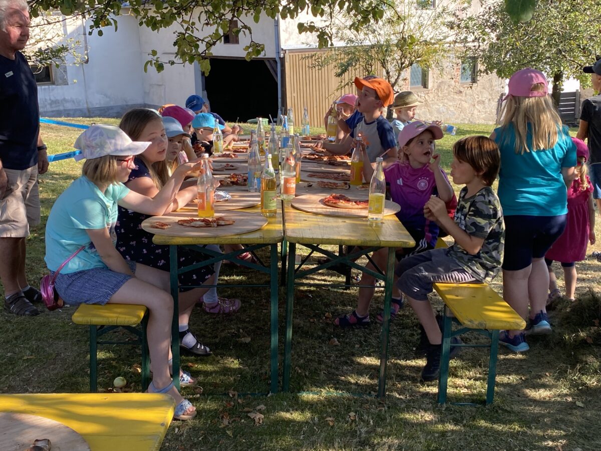 Unter schattigen Obstbäumen im „Zimmerhansl-Garten“ wurde genüsslich mit einem passenden Getränk gespeist. Was nicht geschafft wurde, gab es mit nach Hause. Die angebotenen Spiele waren schnell zu Ende, als Eis als Nachspeise ausgerufen wurde. Beim Sturm auf die Kühltasche konnte sich jeder seine Lieblingssorte aussuchen. Viel zu schnell war die Zeit verflogen, als sich die Kinder, abgeholt von ihren Eltern, auf den Heimweg machen mussten. Auf das nächste Jahr freuen sich aber bereits jetzt schon alle.