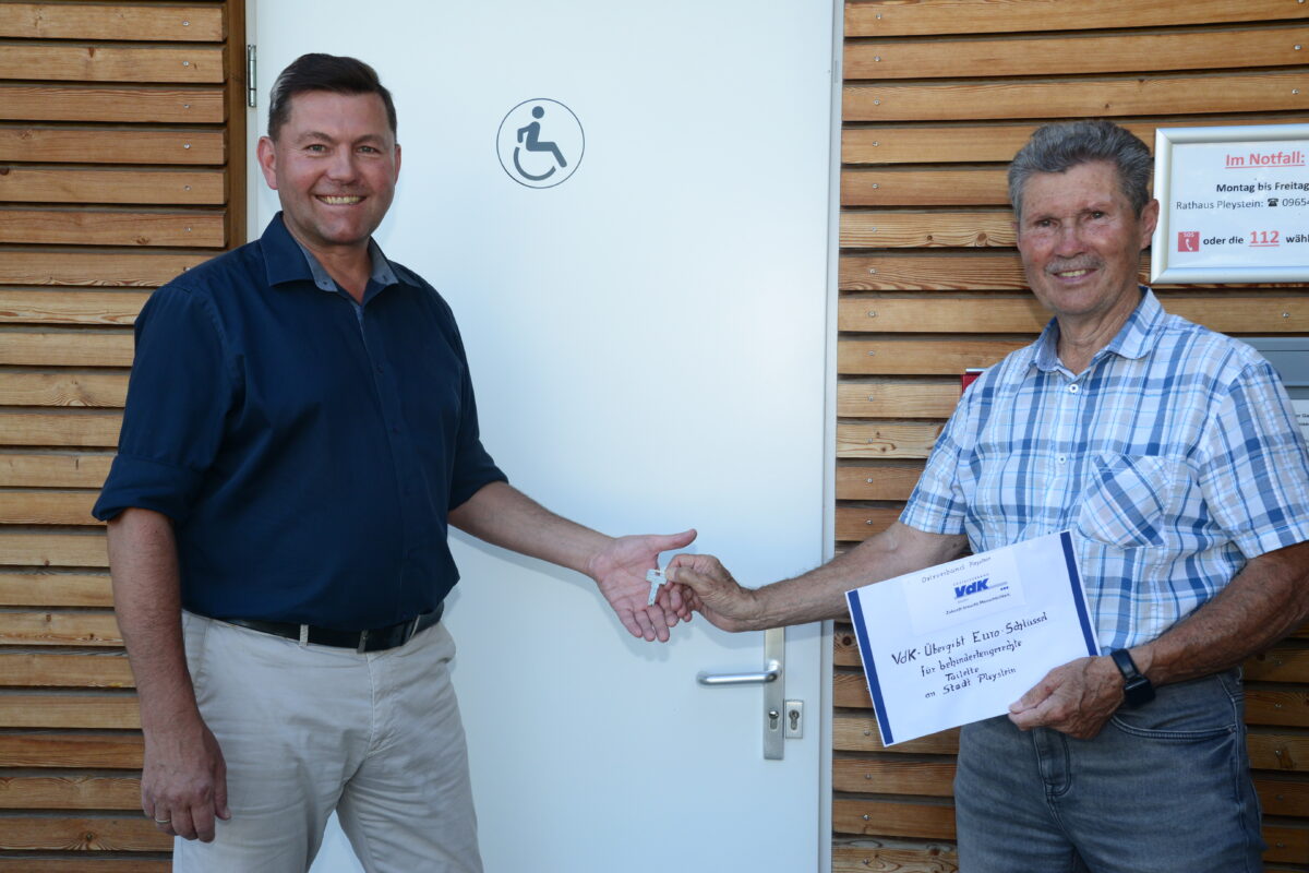 VdK-Ortsvorsitzender Josef Rewitzer und Schriftführer Peter Trstan übergaben Bürgermeister Rainer Rewitzer symbolisch einen „Euro-WC-Schlüssel“.