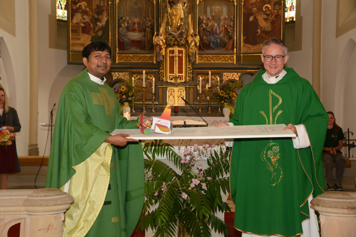 Nach dem Gottesdienst am Sonntagmorgen überreichte Stadtpfarrer Adam Karolczak Pater John als Abschiedsgeschenk ein Modell einer Flugzeuglandebahn mit einem kleinen Flugzeug, beladen mit Süßigkeiten. In seiner Rede erinnerte er daran, wie sie vor zwei Jahren gemeinsam nach Pleystein kamen. Annemarie Woppmann, Vertreterin der Pfarreiengemeinschaft und des Pfarrgemeinderates, überreichte ein Fotobuch über die Kreuzbergkirche. Auch die Ministranten machten ein Geschenk: ein T-Shirt für Pater John, falls er Pleystein wieder besucht.