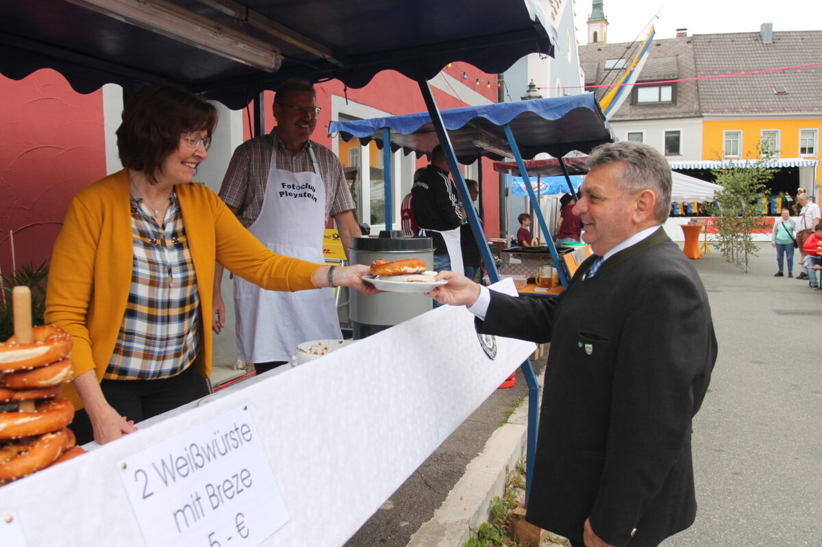 Pulverdampf gehört in der „Pulverstadt Pleystein“ dazu. Also gaben Böllerschützen am Sonntag nach dem von Pfarrer Adam Karolczak und Pater Stefan Weig in der Pfarrkirche St. Sigismund zelebrierten Gottesdienst mit drei Krachern den Startschuss, bevor Bürgermeister Rainer Rewitzer in die Menge rief: „Das Bürgerfest ist offiziell eröffnet.“ Das Areal um den Kreuzberg und Stadtweiher war zu diesem Zeitpunkt bereits aufgeräumt. Die „Multi-Kulti-Nacht“ war also „Schnee von gestern“, und die Gäste ließen sich musikalisch und kulinarisch am Marktplatz verwöhnen.