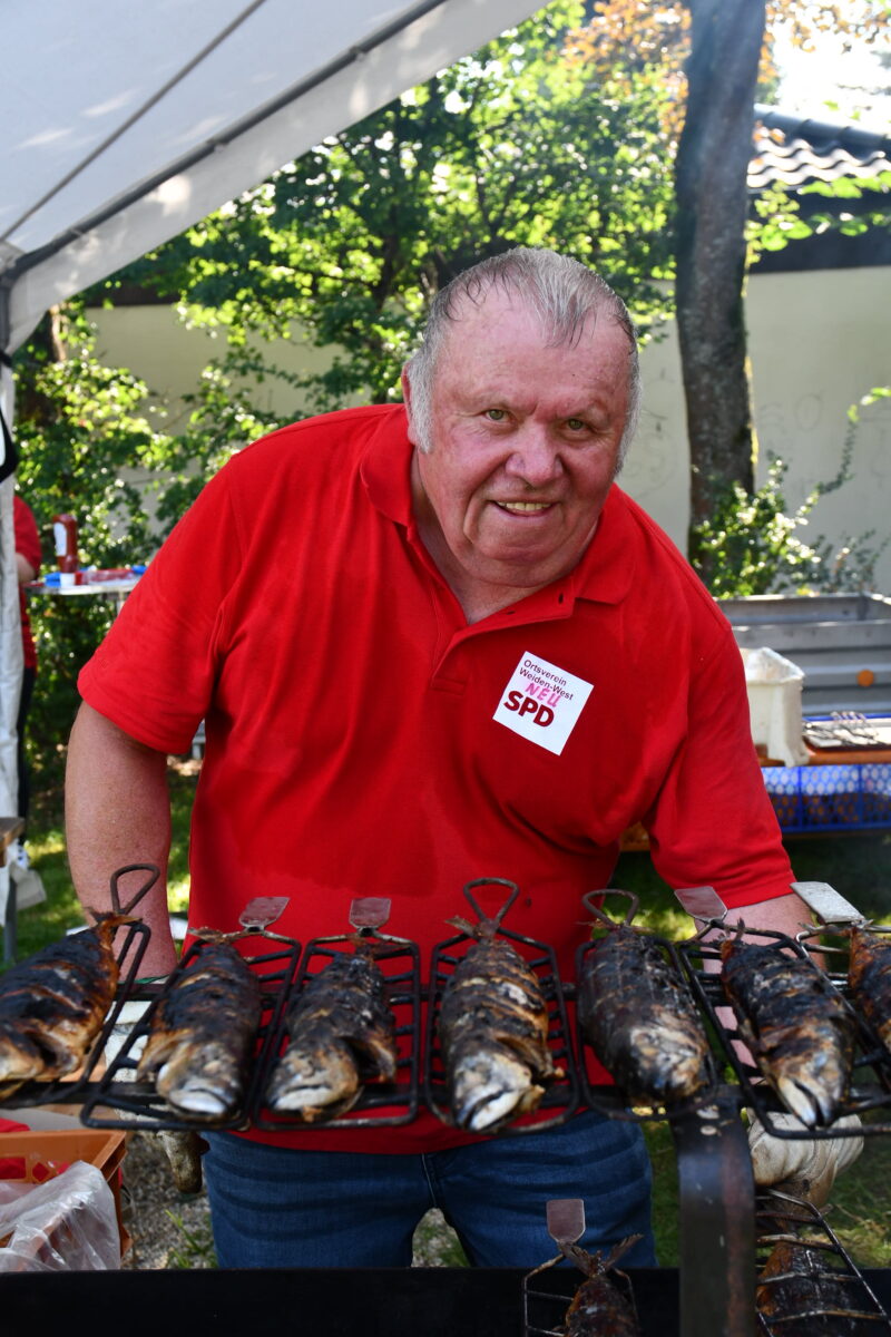 Der SPD-Ortsverein und die Rehbühlsiedler nutzten den Ort des Spielplatzes gemeinsam. Am Tag zuvor veranstaltete die Siedler ihr Kinderspielplatz Fest und Hand in Hand wurde gemeinsam auf- und abgebaut. SPD-Stadtrat Gerald Bolleininger übernahm die Begrüßung, da der Ortsvorsitzende Herbert Hammer alle Hände beim Grillen der Makrelen voll zu tun hatte. Neben seiner Stadtratskollegin Sabine Zeidler und dem ehemaligen Bundestagsabgeordneten Werner Schieder, durfte er gleich einige CSU-Stadträte wie Dr. Benjamin Zeitler, Dagmar Nachtigall, Wolfgang Pausch und Stefan Rank von der Bürgerliste begrüßen. Denn dieses Traditionsfest am Rehbühl hat sich in der ganzen Stadt herumgesprochen. Über 120 Makrelen fanden ihre Abnehmer und das Team um Herbert Hammer und Herbert Schmid ließen keine Wünsche offen.
