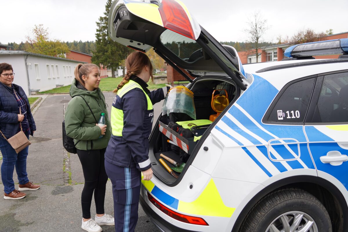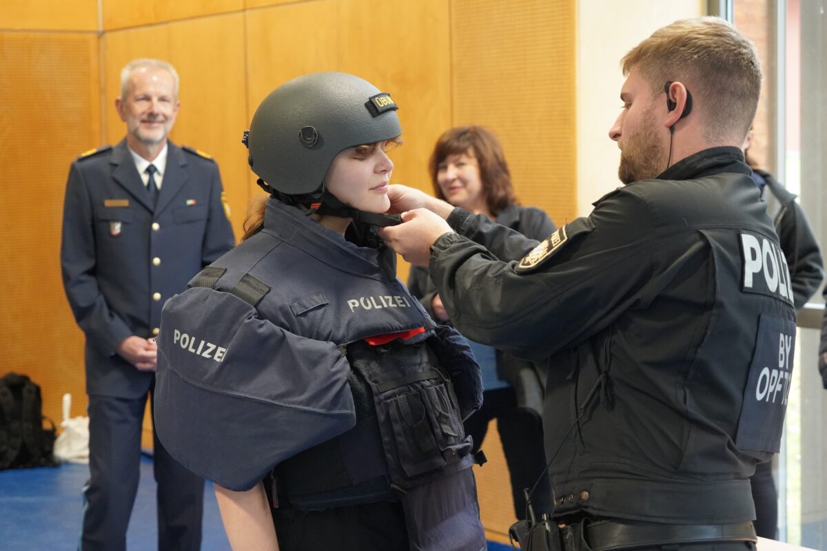 An verschiedenen Stationen lernten die knapp 70 jungen Teilnehmer, viele waren auch mit ihren Eltern gekommen, die Polizei näher kennen. So konnten sie die Schutzausrüstung anprobieren und bekamen erklärt, in welchen Einsatzlagen das sehr schwere Equipment Verwendung findet. Was trägt ein Polizist am Gürtel? Dazu wurden Waffen, Ausrüstung und Fahrzeuge vorgestellt. Die Jugendlichen konnten sich auch in Einsatzfahrzeuge setzen, alle Ausrüstungsgegenstände anfassen und sich darüber informieren. Zahlreiche Polizeibeamte aus der Oberpfalz standen als Ansprechpartner zur Verfügung. Auch Polizeivizepräsident Thomas Schöniger war zur Veranstaltung gekommen.