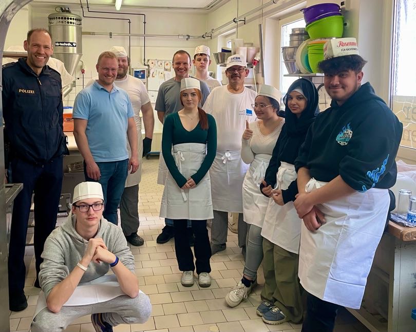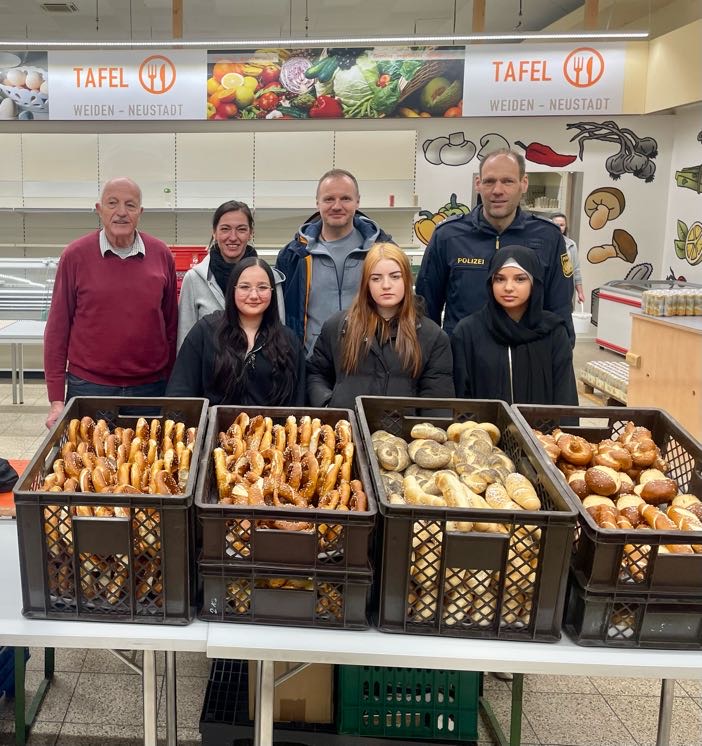 Unterstützt durch die Polizeiinspektion wurden die frischen Backwaren des Tages verladen und zur Weidener Tafel gebracht, wo sich Bedürftige nach Herzenslust bedienen durften. So erlebten nicht nur die Schülerinnen und Schüler der Praxisklasse einen Einblick in den Berufsalltag. Es konnten sich auch Bedürftige über frische Backwaren freuen.