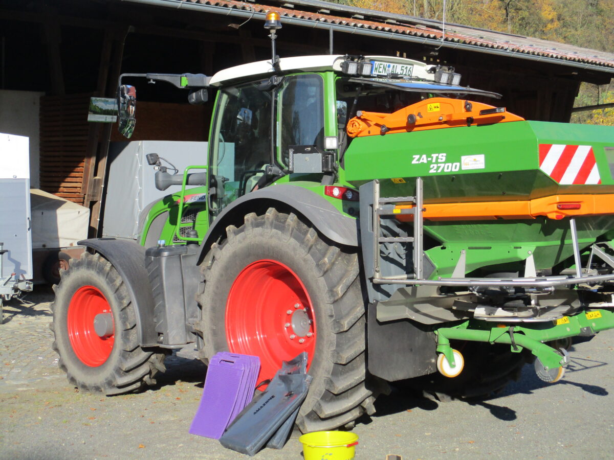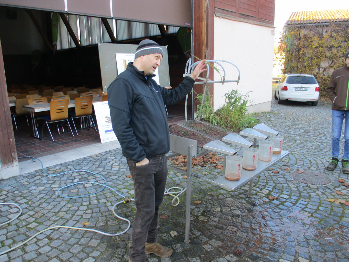 Ein Regensimulator zeigte anschaulich, wie sich Starkregenereignisse auf unterschiedliche Böden auswirken. Dabei wurde deutlich, dass unterschiedliche Bodenbedeckung (zum Beispiel bracher Acker im Vergleich zu einer Zwischenfrucht) und Bodenstruktur maßgeblich bestimmen, wie stark Erosion und Abfluss auftreten. „Starkregenereignisse haben sich über die letzten Jahre vermehrt und können große Schäden anrichten“, betonte Michael Lukas, Experte vom Amt für Ernährung, Landwirtschaft und Forsten (AELF) für den Bereich Wasser. Ergänzend wurde das digitale System „Amazone Easy Check“ vorgestellt. Mit diesem Werkzeug lässt sich die Düngerverteilung im Feld einfach und präzise überprüfen – ein Beitrag zur effizienten und ressourcenschonenden Nährstoffausbringung.