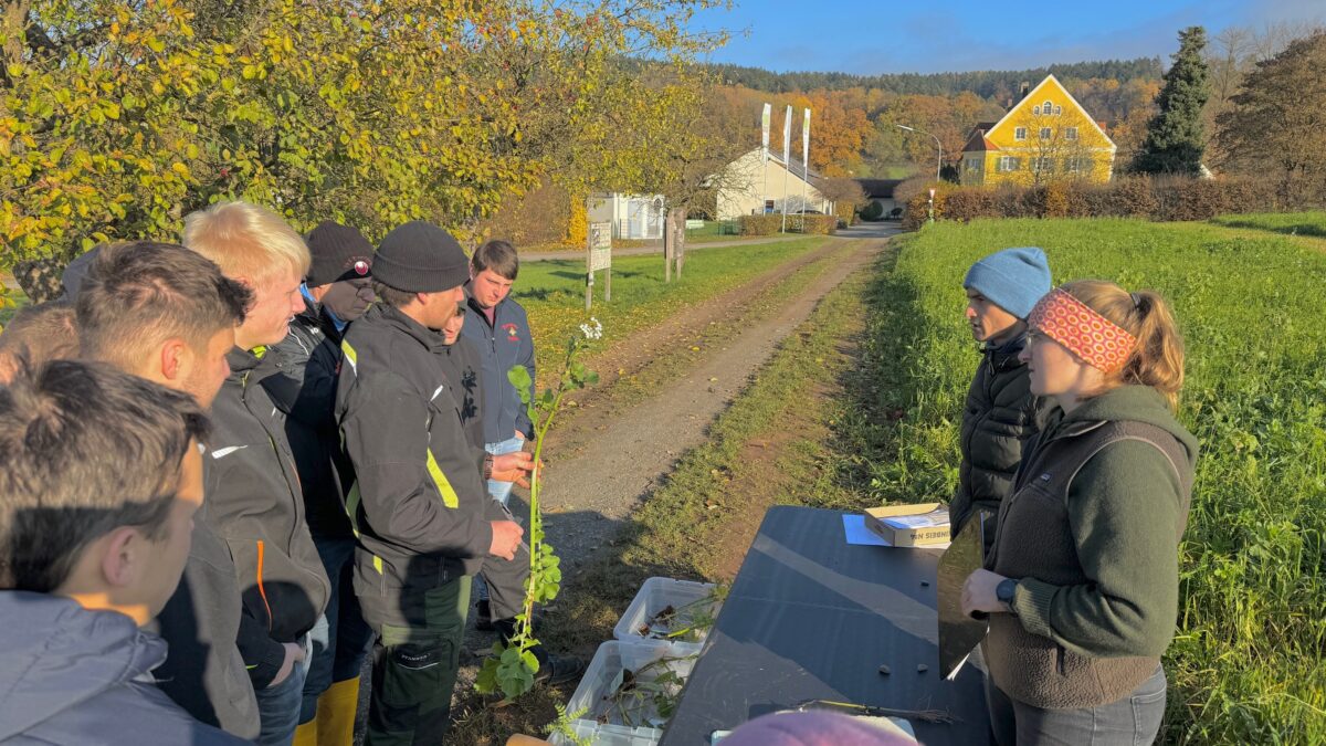 An der zweiten Station wurden verschiedene Zwischenfruchtmischungen im Feld betrachtet. Mithilfe einer Spatenprobe konnten die Studierenden die Bodenstruktur untersuchen und den Einfluss der Pflanzenwurzeln auf Lockerung und Durchlüftung beobachten. Zwischenfrüchte leisten so einen wichtigen Beitrag zur Erosionsminderung, zur Nährstoffspeicherung und zur Förderung des Bodenlebens.