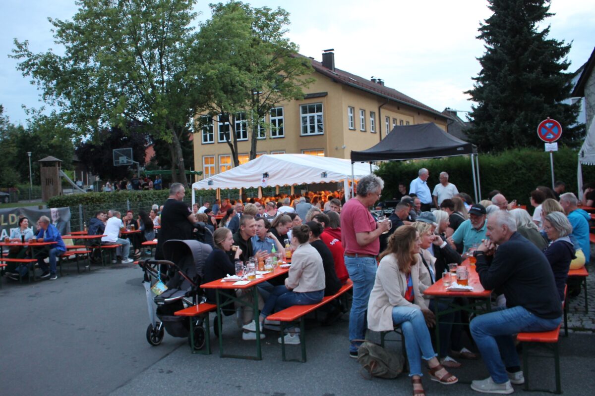 Hatte am Nachmittag noch leidlich heiteres Wetter geherrscht, so zogen gegen Abend graue Wolken auf, die nach dem Anzapf-Zeremoniell eine Stunde lang für „schauerliche“ Witterung sorgten. Der guten Stimmung tat das regnerische Intermezzo, nach dem sich Petrus der Festgemeinde wieder „milder gestimmt“ erwies, aber keinen Abbruch, die Speisen- und Getränkevorräte in den Verkaufsständen leerten sich zügig, und auch in der Weinstube, deren Eröffnung der Sankt-Georg-Chor mit dem „Chiantiweinlied“ und „Griechischer Wein“ kundtat, und im Barpavillon mit Musik von „DJ FE“ aus Dießfurt hatten die Helfer zünftig zu tun.