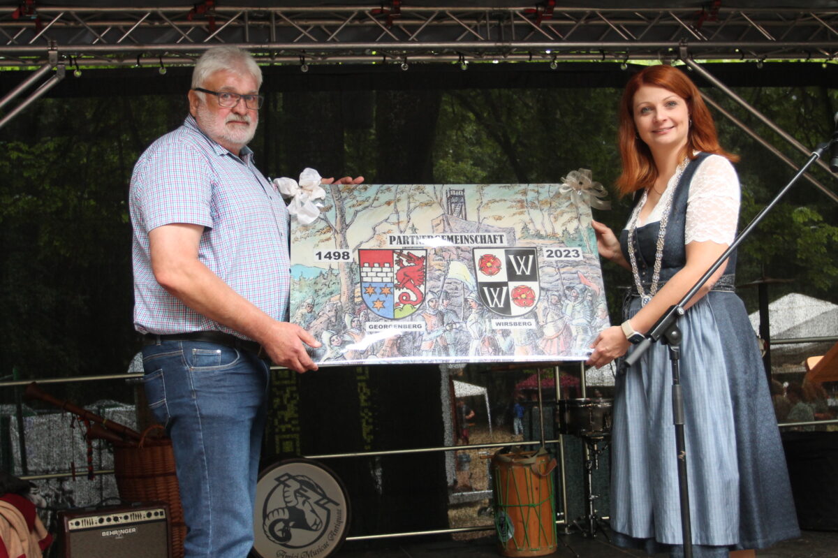 „Leider werden es immer weniger Zeitzeugen“, bedauerte Karl-Heinz Krüger. Das Wirsberger Marktgemeinderatsmitglied, unter anderem in Begleitung von Geschäftsleiterin Andrea Müller und einer Abordnung der Feuerwehr, erinnerte an viele Begegnungen und hoffte, „dass unsere Partnerschaft wieder mehr belebt wird“. An diese soll laut Hirnet – sowohl in Wirsberg als auch in Georgenberg – die an Krüger übergebene große Tafel hinweisen. Kreiert hat sie Georgenbergs Kunstmaler Reinhold Schultes.
