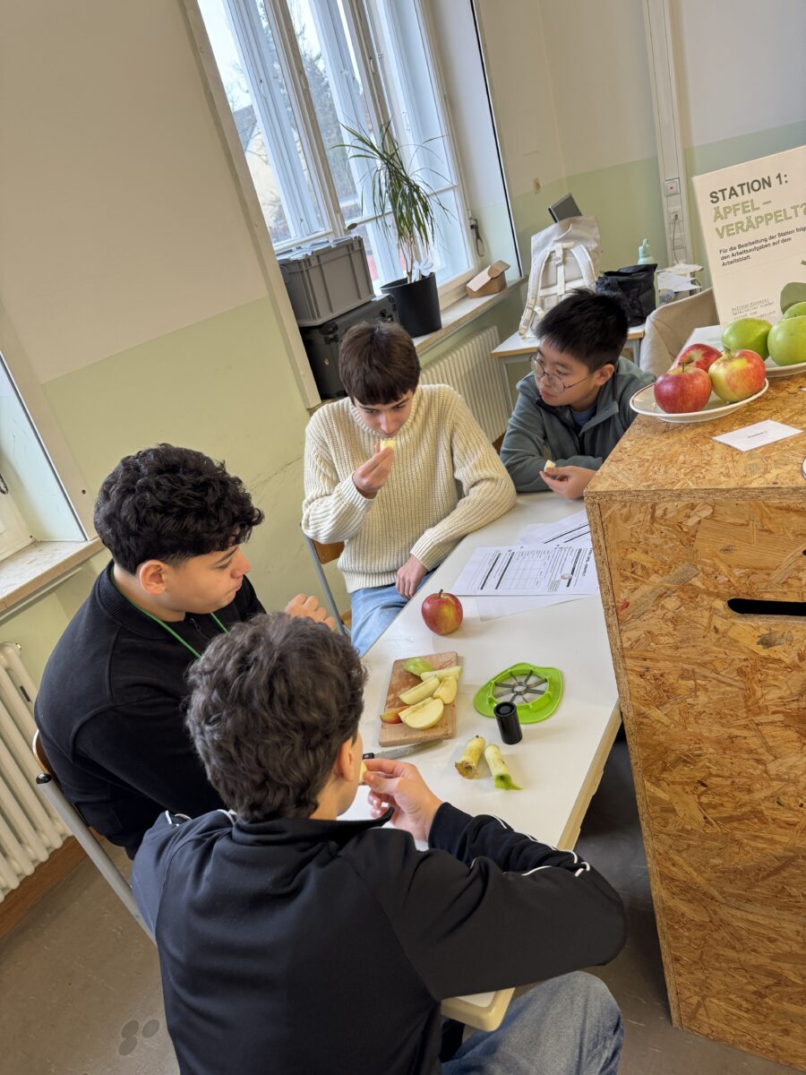 Nach der Begrüßung durch die Schulleiterin ging es dann an die Praxis. In den zwei Schulstunden konnten die Schülerinnen und Schüler in die Welt der Sinne eintauchen und zu Sensorikern werden. An den vier aufgebauten Stationen durften sie verschiedene Apfelsorten unterschiedlicher Herkunft kosten und bewerten, Zuckerlösungen anhand ihrer Süße anordnen und Zuckerwürfel diesen zuordnen sowie verschiedenfarbige Joghurtproben kosten. Ein abschließendes Quiz sorgte für zusätzlichen Spaß und festigte das neu erworbene Wissen über Lebensmittel und die Sinne.