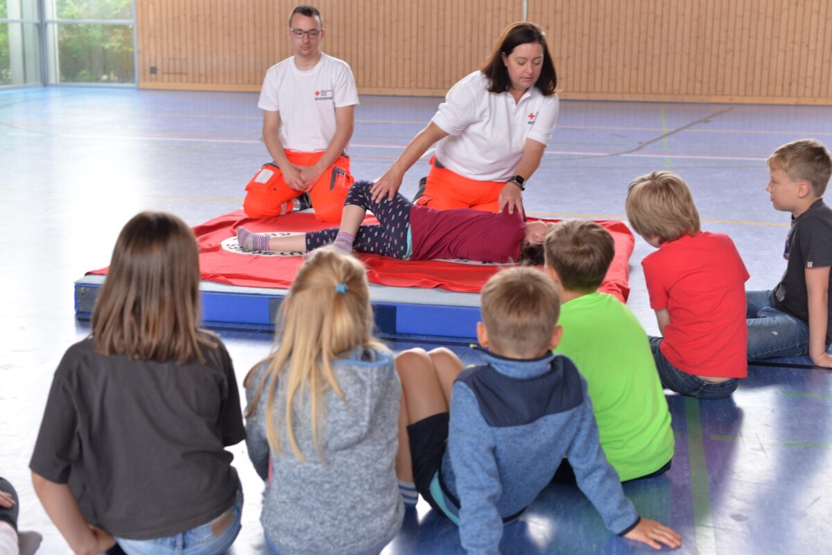 In der Turnhalle und am Hintereingang der Schule hatte der HvO Haidenaabtal seine Stationen, dabei wurde den Schüler die stabile Seitenlage und das Reagieren und Helfen bei einem Unfall demonstriert und gezeigt. Diese durften die Schüler natürlich auch sofort üben.