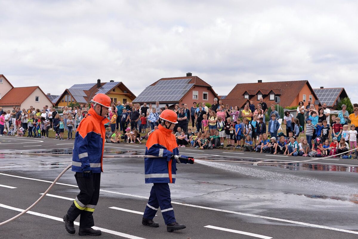 Nach den vier Unterrichtsstunden kamen ebenfalls die Eltern und Verwandten der Schüler hinzu; diese versammelten sich auf dem Sportplatz, um der Demonstration eines Fettbrandes unter Moderation des Kommandanten Timo Krauß zu lauschen.