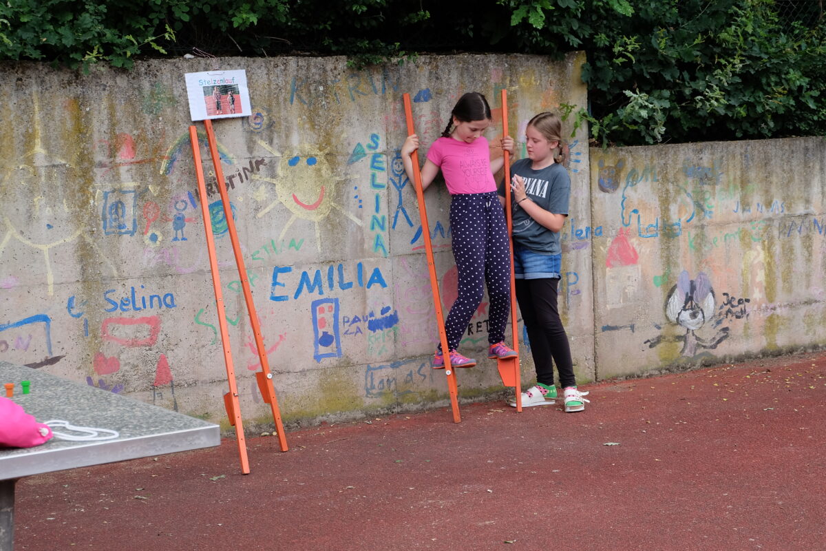 Schulleiterin Gabriela Bäumler lud alle Gäste ein, sich aktiv an den angebotenen Aktivitäten zu beteiligen und an den interessanten Workshops teilzunehmen, oder den Kindern über die Schulter zu schauen. Auf dem Allwetterplatz durchliefen die Schülerinnen und Schüler verschiedene Pausenspiele, wie sie damals schon üblich waren und probierten sich beim Stelzenlauf, Sackhüpfen, oder Streckenlauf. In den Klassenzimmern gab es Infos und Workshops zu den Themen Griffel und Tafel, Feder und Tinte, Basteln, Interviews und noch vieles mehr.