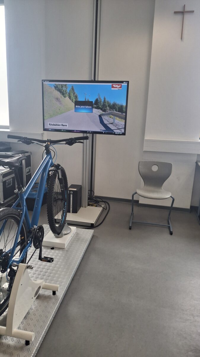 Ein besonderes Highlight war an diesem Tag ein Fahrradsimulator. Mit diesem wurde den Schülern der 12. Klassen ermöglicht, die Auffahrt zum Stilfser Joch zu testen. Die Simulation hatte dabei die durchschnittliche Steigung von acht Prozent. Beachtliche sportliche Leistungen und teilweise überraschend hohe Wattzahlen wurden von ihnen erreicht. Ebenso maßen sich die Teilnehmer des Road2Riva-Teams gegenseitig mit dieser Simulation.