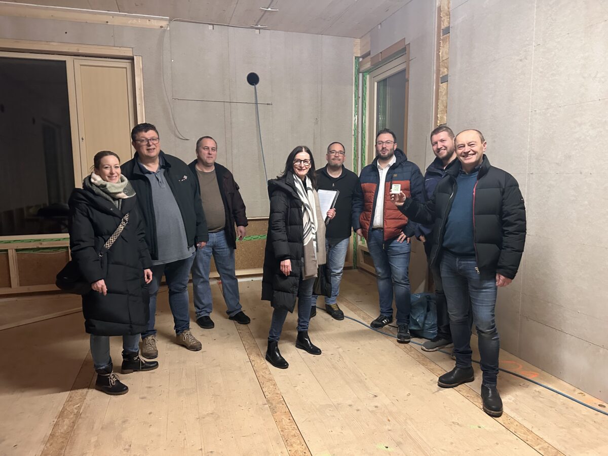 Marion Braun und Sebastian Grundler von den 2G-Architekten Weiden erklärten am Mittwoch beim Rundgang dem derzeit amtierenden Bürgermeister Julian Kraus, den Gemeinderäten und Johann Lambert vom Technischen Bauamt der Gemeinde Weiherhammer die großzügige Raumaufteilung der in Holzbauweise entstehenden Kita. Im Erdgeschoss werden Kinderkrippe und Kindergartengruppe, im Obergeschoss eine zweite Kindergartengruppe untergebracht. „Wir sind im Zeitplan. Nach dem Dreikönigstag beginnen die Estricharbeiten, und der Innenausbau für das 4,23-Millionen-Euro-Projekt folgt“, bemerkte Braun.