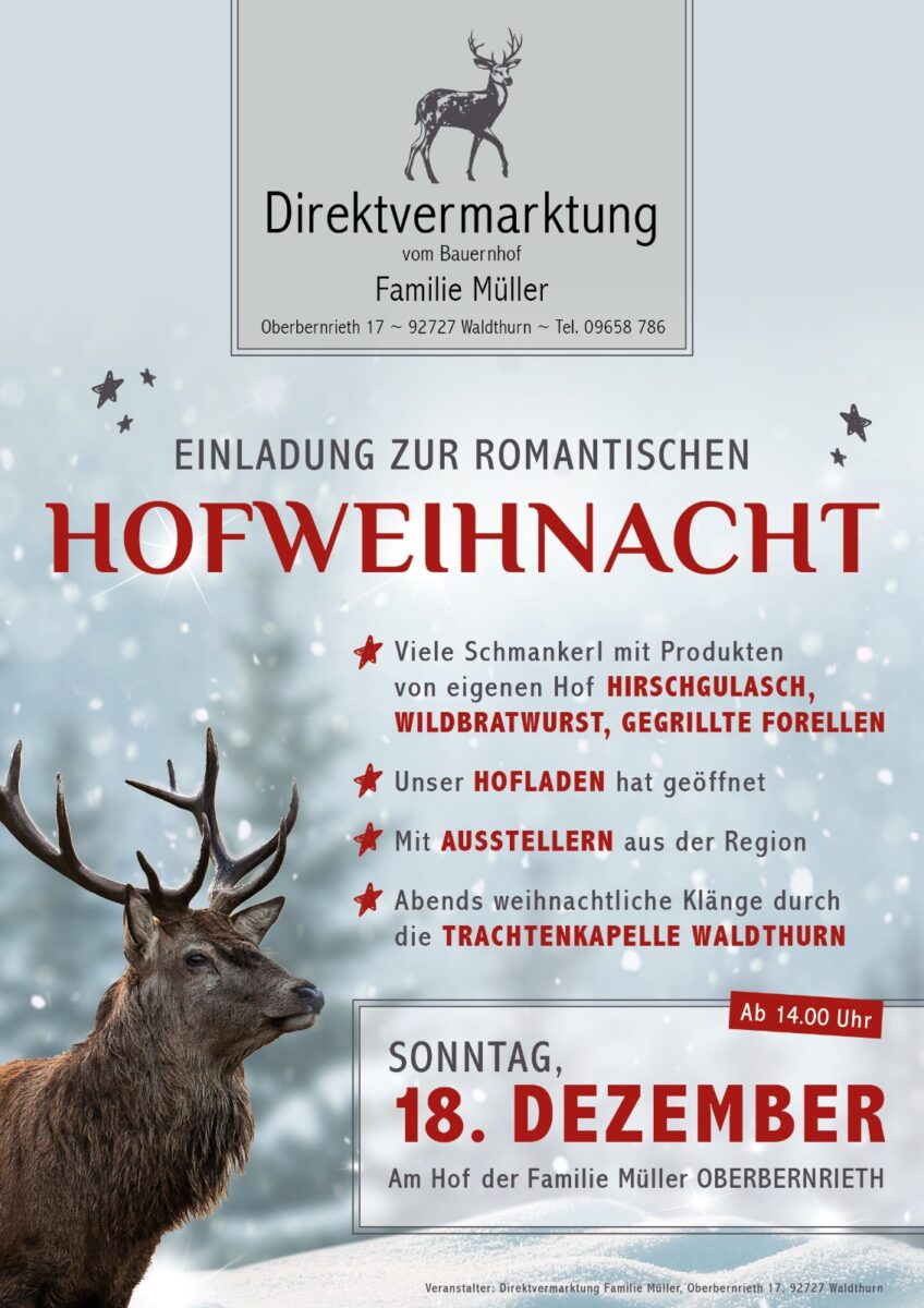 Dabei spielt am Abend die Trachtenkapelle Waldthurn weihnachtliche Klänge, es sind Aussteller aus der Region vor Ort und es gibt viele Schmankerl mit Produkten aus eigener Vermarktung, wie Hirschgulasch, Wildbratwurst und gegrillte Forellen. Auch der Hofladen der Familie Müller hat geöffnet.