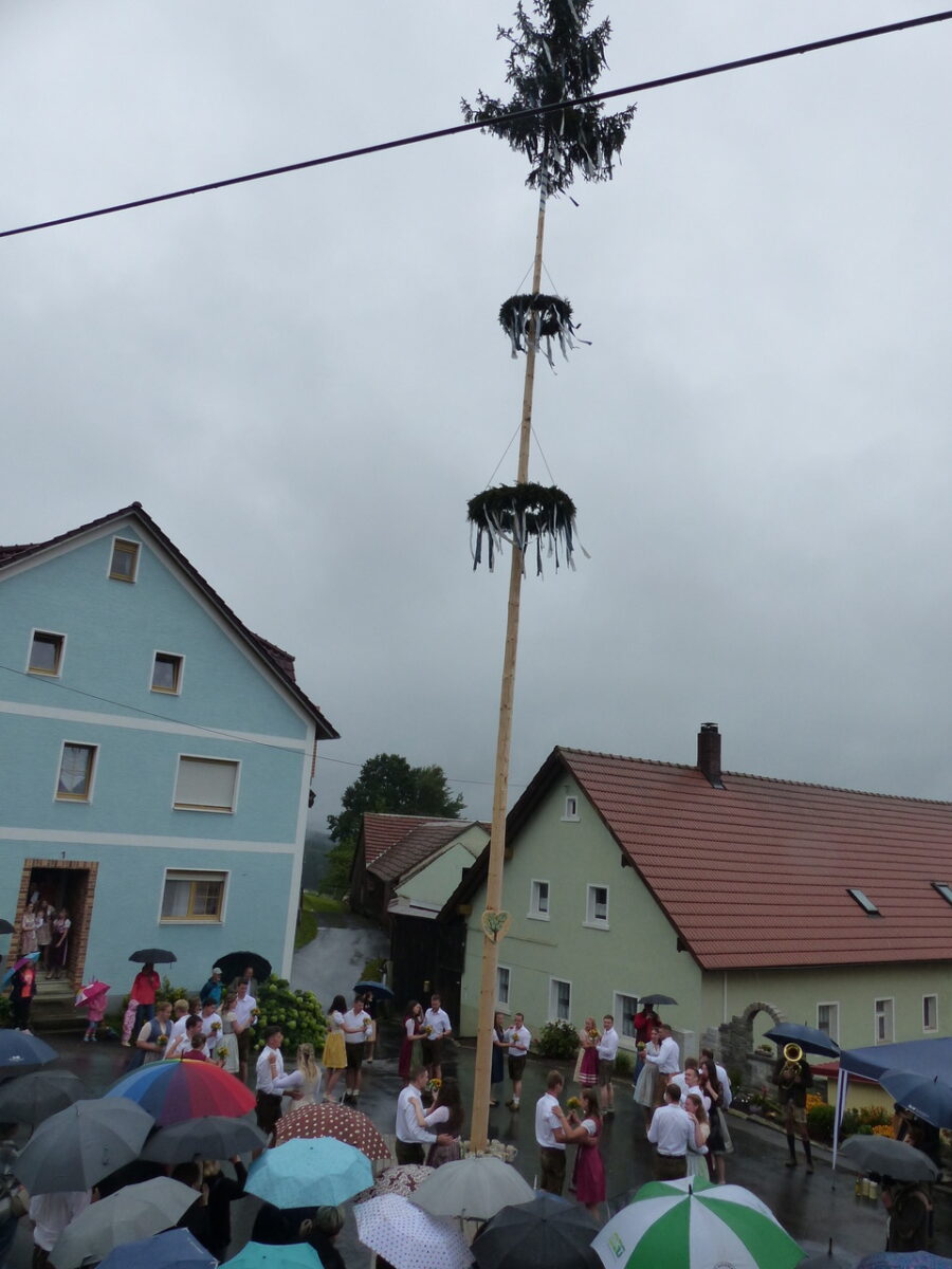 Bereits am Samstag wurde der 21 Meter lange Baum auf dem Dorfplatz aufgestellt, spendiert von Johannes Beierl. Zuvor hatten die Kirwaleit den Baum geschmückt und mit der Erinnerungstafel versehen. Danach wurde in der „Dorfschenke“ und in der angrenzenden Halle bis weit nach Mitternacht gefeiert, es war kein Platz mehr frei. Wie viele es waren konnte kaum gezählt werden, es war ein ständiges Kommen und Gehen – schließlich ist die Roßwampenkirwa ein ganz besonderer Anziehungspunkt. So heizte der „Schmucker Kare“ am Samstagabend die Bombenstimmung noch zuständig mit seinen Instrumenten noch an.