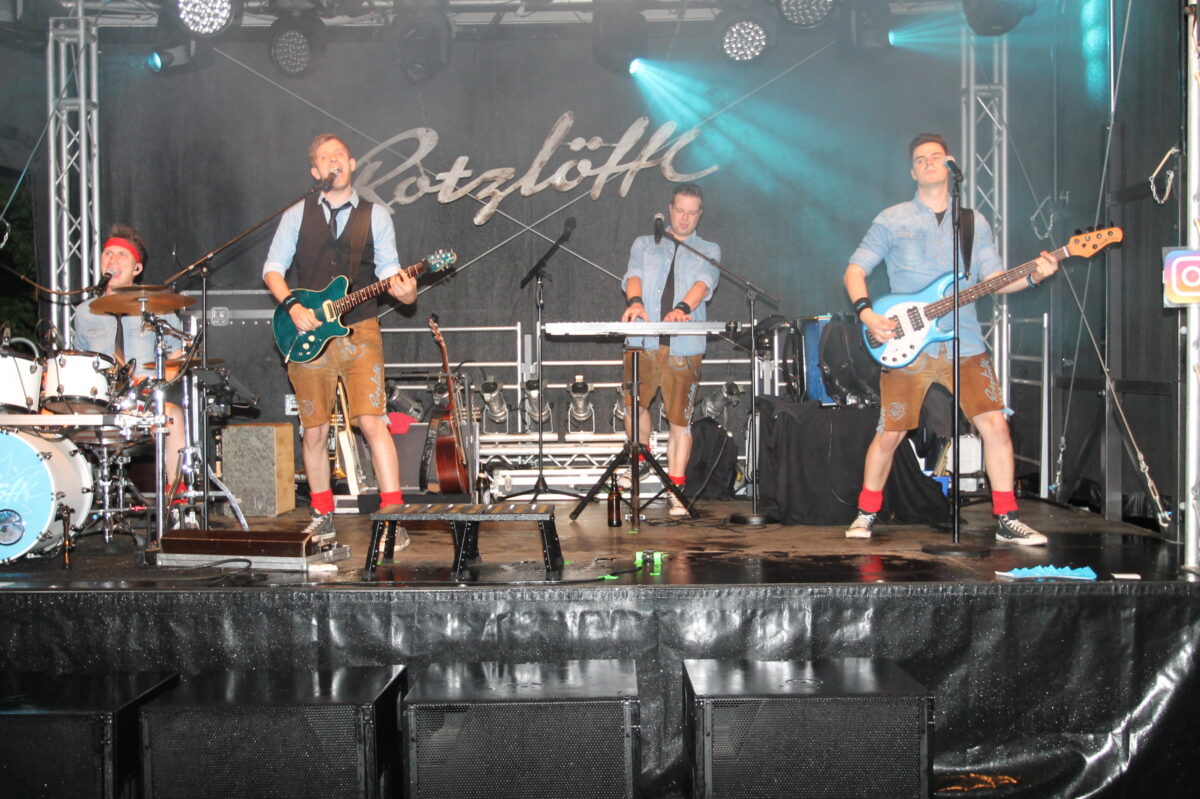 Der Regenschauer war jedoch bald vorbei, sodass das Open Air im Rahmen der 525. Wiederkehr der Erstürmung der Burg Schellenberg, verbunden mit dem 25-jährigen Partnerschaftsjubiläum mit dem Markt Wirsberg, pünktlich starten könnte. Die Partynacht mit der Band „Rotzlöffl“ sollte es dann auch in sich haben. Rocksound der Spitzenklasse, verbunden mit Showacts, riss das Publikum mit und sorgt für Stimmung pur auf der Planer Höhe. Zum Repertoire der vier Musiker, die auch Andreas Gabalier oder Peter Maffay ihre Referenz erweisen, gehören auch eigene Titel wie „Maria, bring mir a Bier“ oder „Fensterln geh’n“.