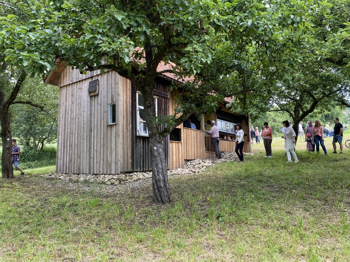 Aus seinem Dornröschenschlaf wurde das vor über siebzig Jahren im „Hansellergarten“errichtete Bienenhaus durch eine umfassende Sanierung geweckt und wird eine Außenstation des „Hauses der Biodiversität“. Nach zwanzig Jahren ist jetzt das Gebäude wieder mit drei Bienenvölkern besetzt, die in der angrenzenden Streuobstwiese ausreichend Pollen und Nektar finden.