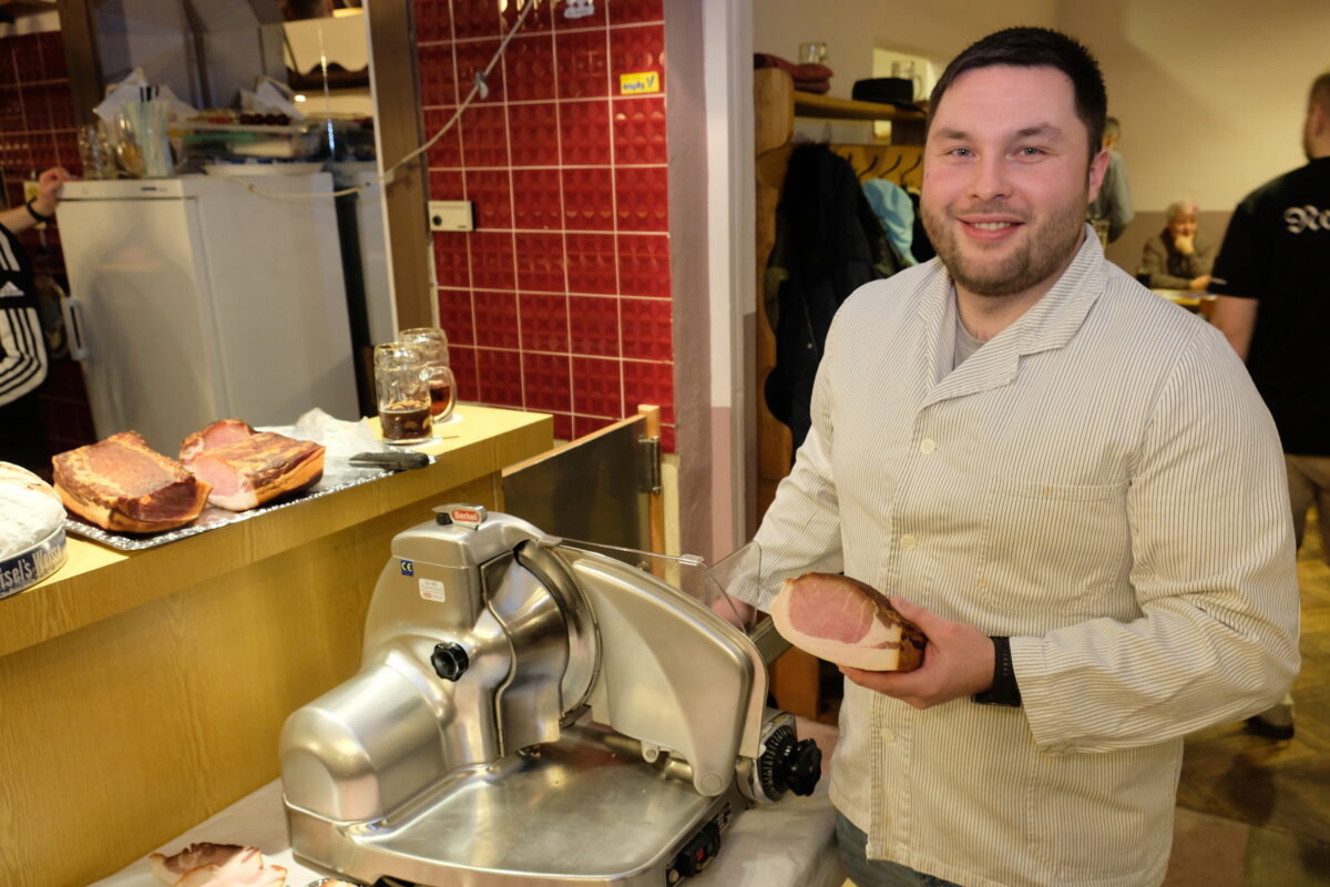Dabei handelt es sich um eine Delikatesse, die lange reifen muss. Mit viel Leidenschaft und Fachwissen stellt Hans-Jürgen Schindler die Kulm-Spezialität her. „Hannis“ Geselchtes, serviert mit frischem Bauernbrot, ist einmalig, bestätigten am Samstagabend die zahlreichen Genussmenschen. Beim Bauernschmaus mit einem Aroma zum Dahinschmelzen spielte am Samstagabend wenigstens symbolisch auch „Omas Wurstschneide“ von Elfriede Dollhopf, einem Utensil aus der ehemaligen Metzgerei, eine Rolle. Symbolträchtig, von Lukas Schindler hauchdünn aufgeschnitten, wurde schon dieses Prozedere zum Hingucker. „Es geht mir darum, schon beim sachgerechten Aufschneiden und Präsentieren den Appetit der Gäste zu wecken“, befand der Spezialist an der Schneide augenzwinkernd.