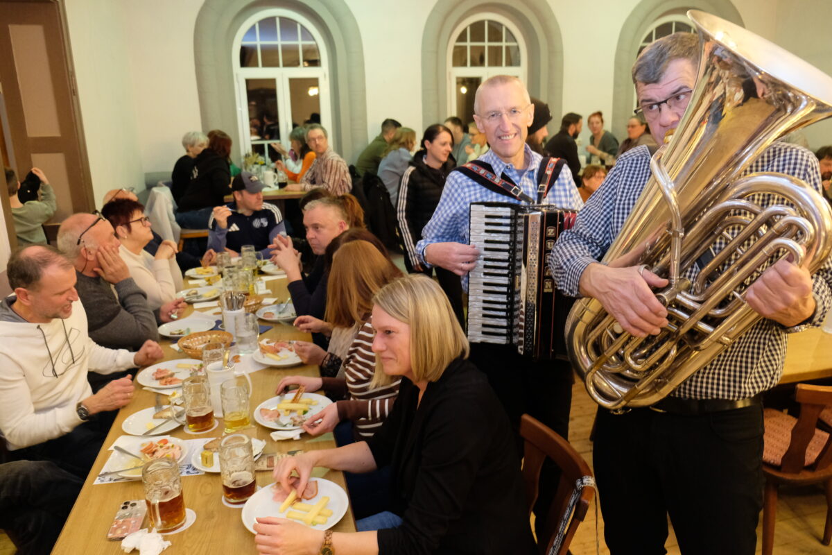 Das Publikum lechzte nicht nur nach dem herzhaft-milden Geselchten. Beim Blick in die Speisekarte ist das kein Wunder. Die gastgebenden Kicker lockten mit weiteren Schmankerln. Hannis Geräuchertes mit Bergkäse, Stadtwurst mit Musik, Schweizer Wurstsalat oder eine gemischte Käseplatte – die Brotzeitangebote waren reichlich. Zum Geräucherten kam Flüssiges: Gerstensaft vom Fass, hell oder dunkel, und Hochprozentiges von der örtlichen Culm-Feinbrennerei. Es triumphierte das Schlemmen und Genießen, begleitet von urigen Volksmusikklängen der „Zünftigen“.