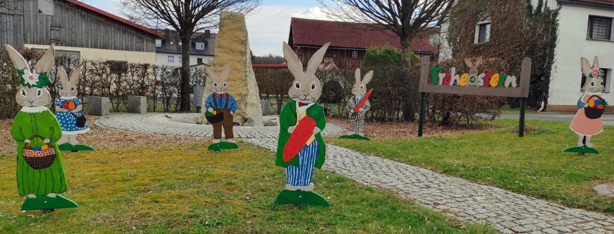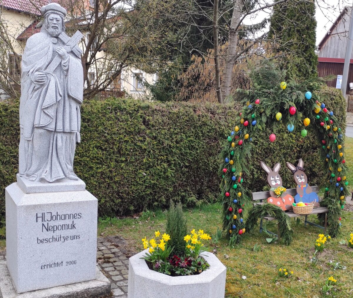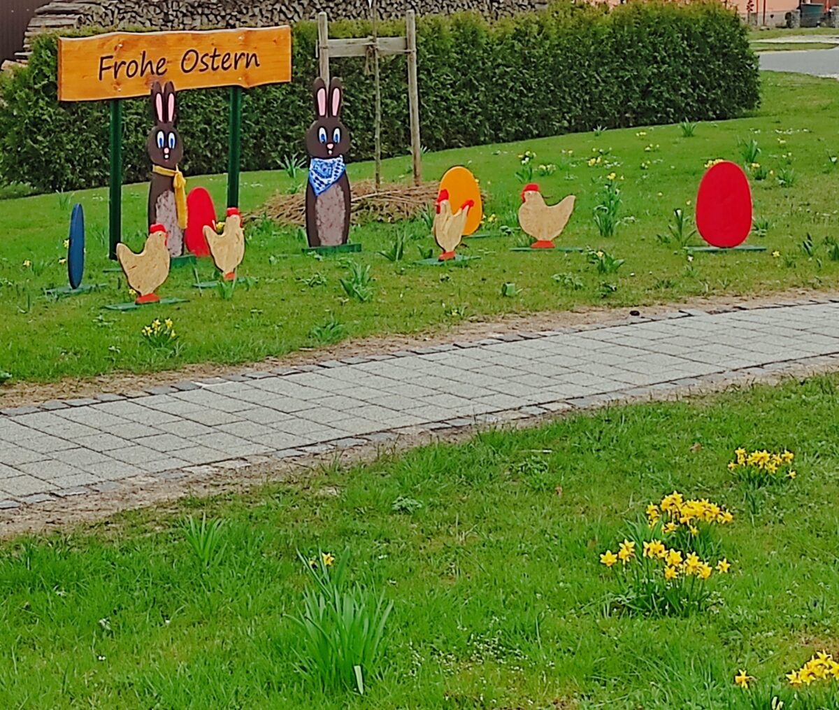 In Menzlas hat sich ein Hasenpärchen in der Nähe der Creußenbrücke bei der Nepomukstatue häuslich eingerichtet. Unter einem Reisigbogen warten die beiden offenbar ganz entspannt auf ihren Einsatz – vielleicht beim Verstecken der Ostereier. In Moos empfangen gleich sechs bunt bemalte Osterhasen die vorbeikommenden Besucher und wünschen auf einem Schild fröhlich „Frohe Ostern“. Auch in Ernstfeld zeigt sich die Dorfkreativität: Vier eifrige Hühner scheinen dort gerade dabei zu sein, ihre bunten Eier an ein stilvoll herausgeputztes Hasenpaar zu übergeben.