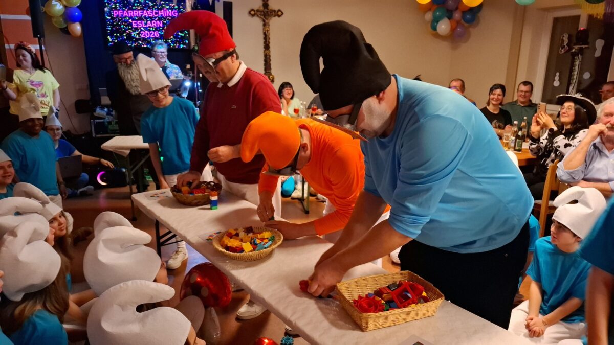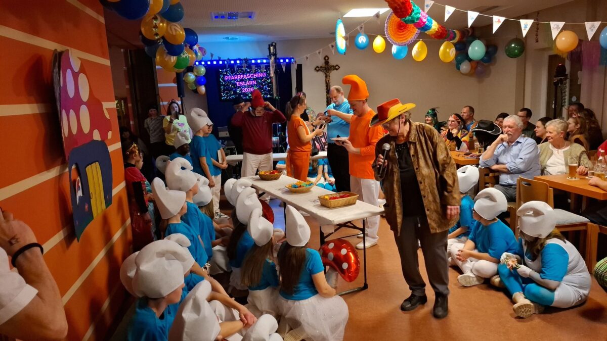 Der Pfarrfasching im Pfarrheim „St. Marien“ gehört seit jeher zu den unangefochtenen Höhepunkten der närrischen Zeit – und auch heuer bewiesen die kirchlichen Gremien eindrucksvoll: Kirche kann Fasching! Kulinarisch bestens versorgt durch Mitglieder der Kirchenverwaltung, des Pfarrgemeinderates, des Frauenbundes und der Kolpingfamilie, durften sich die zahlreichen Besucher zudem auf ein Programm freuen, das es ordentlich in sich hatte – inklusive eines wahrlich schlumpfigen Höhepunkts. Hinter die Theke stellte sich Zweiter Bürgermeister Thomas Kleber und mit einem Besuch bereicherten Dritter Bürgermeister Bernd Reil und Marktrat Georg Zierer den Abend. Für den musikalischen Rahmen sorgte Alleinunterhalter „Fonse“ aus Gaisthal, während sich Pfarrer Udo Klösel und Pfarrvikar Basil über ein voll besetztes Pfarrheim freuten. Die kreative Gesamtregie lag in den bewährten Händen von Kirchenpflegerin Nicola Hummer, die ein mit viel Liebe zum Detail ausgearbeitetes Programm präsentierte. Insgesamt 34 Ministrantinnen und Ministranten samt Anhang schlüpften in die Rollen der beliebten Schlumpf-Familie. Die passenden Schlumpfmützen spendierte Nicola Hummer, während die Minis selbst für einheitliche T-Shirts, Röcke und Hosen sorgten.