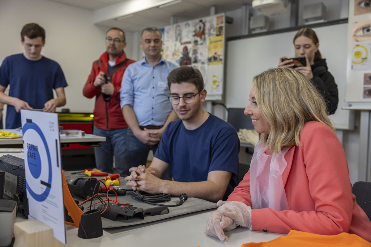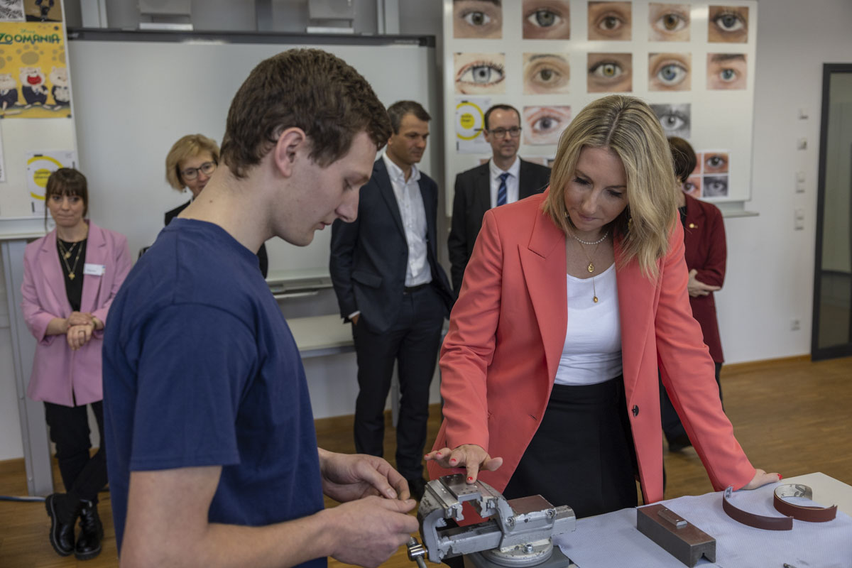 Kultusministerin Anna Stolz hat am Donnerstag die Gustav-von-Schlör-Schule (FOSBOS Weiden) besucht. Bei einer Führung durch die verschiedenen Fachbereiche konnte sie sich von der großen Bandbreite an Ausbildungsinhalten überzeugen.