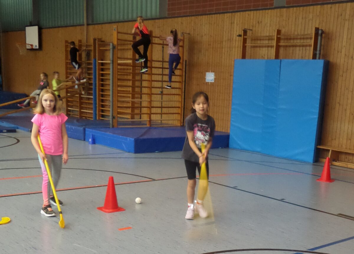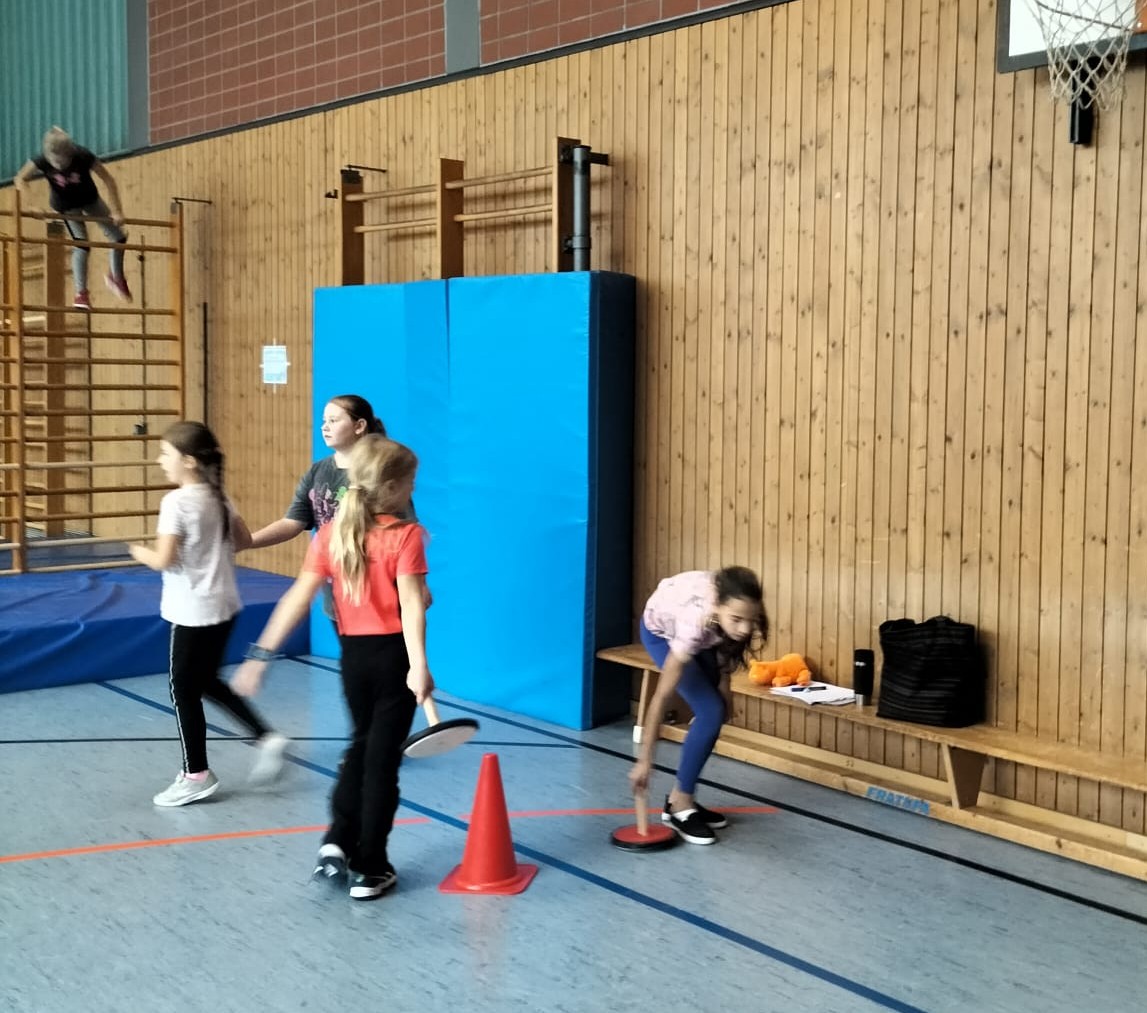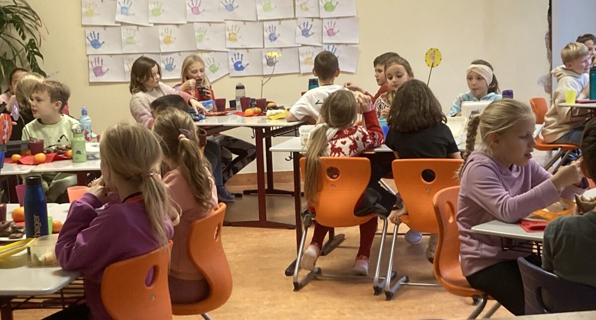 Nach der Begrüßung mit dem Lied „Hallo, hallo, schön, dass du da bist!“, zu dem alle Klassen in den Eingangsbereich gekommen waren, teilten sich die Gäste in zwei Gruppen auf. Während die eine sich für den Bewegungsparcours umzog, ging die andere in ein Klassenzimmer, wo alles für das Basteln vorbereitet war. Jedem Kind aus Eger war ein Kind der Grundschule Etzenricht zugeordnet. Diese fanden schnell, ohne viele Worte, einen Draht zueinander. Gemeinsam wurde geturnt, gebastelt, die Pause verbracht, gegessen und erste Kontakte geknüpft.