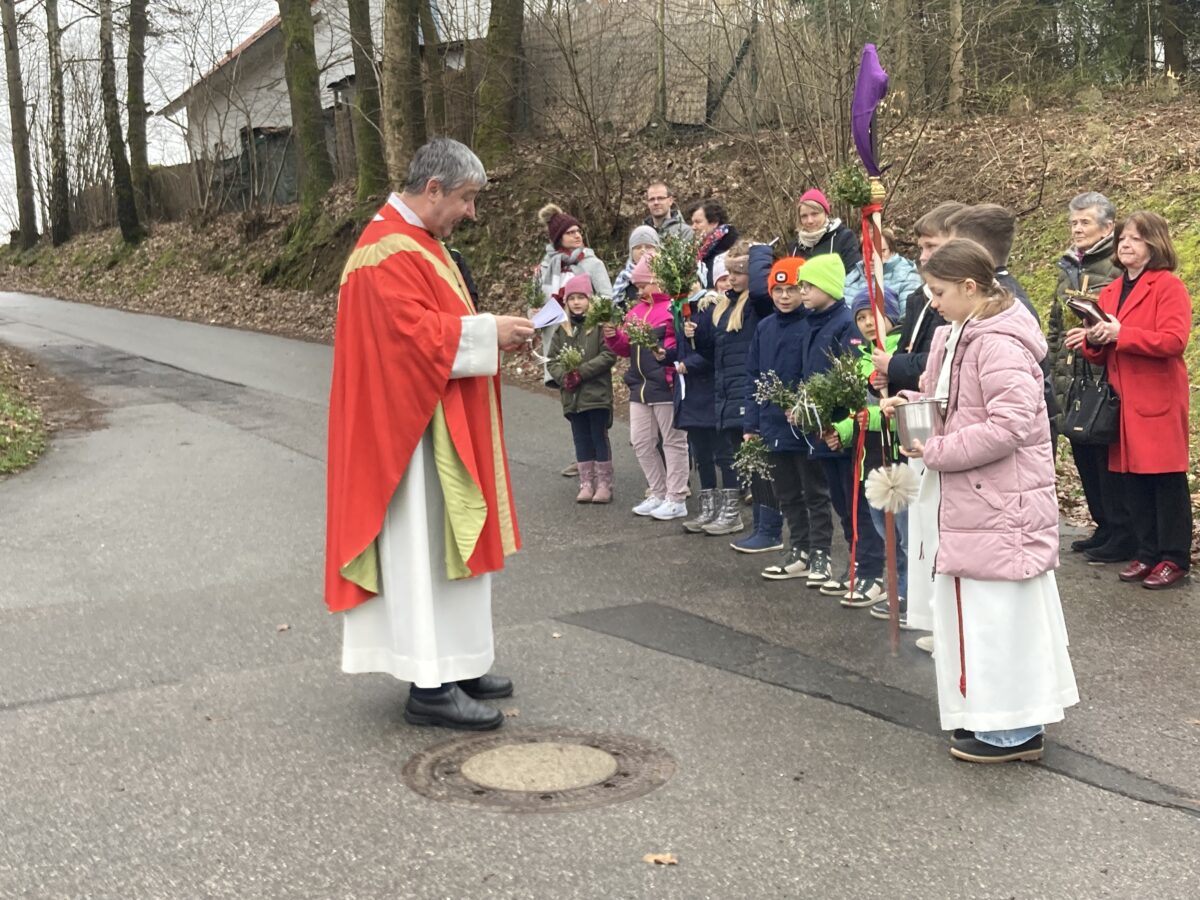 Im Halbkreis hatten sich die Kommunionkinder mit ihren verzierten Palmbuschen neben an der Grotte mit ihren Eltern und den Gläubigen versammelt. Pfarrer Adam Nieciecki sprach das Segensgebet für die Palmzweige und besprengte sie abschließend mit Weihwasser.