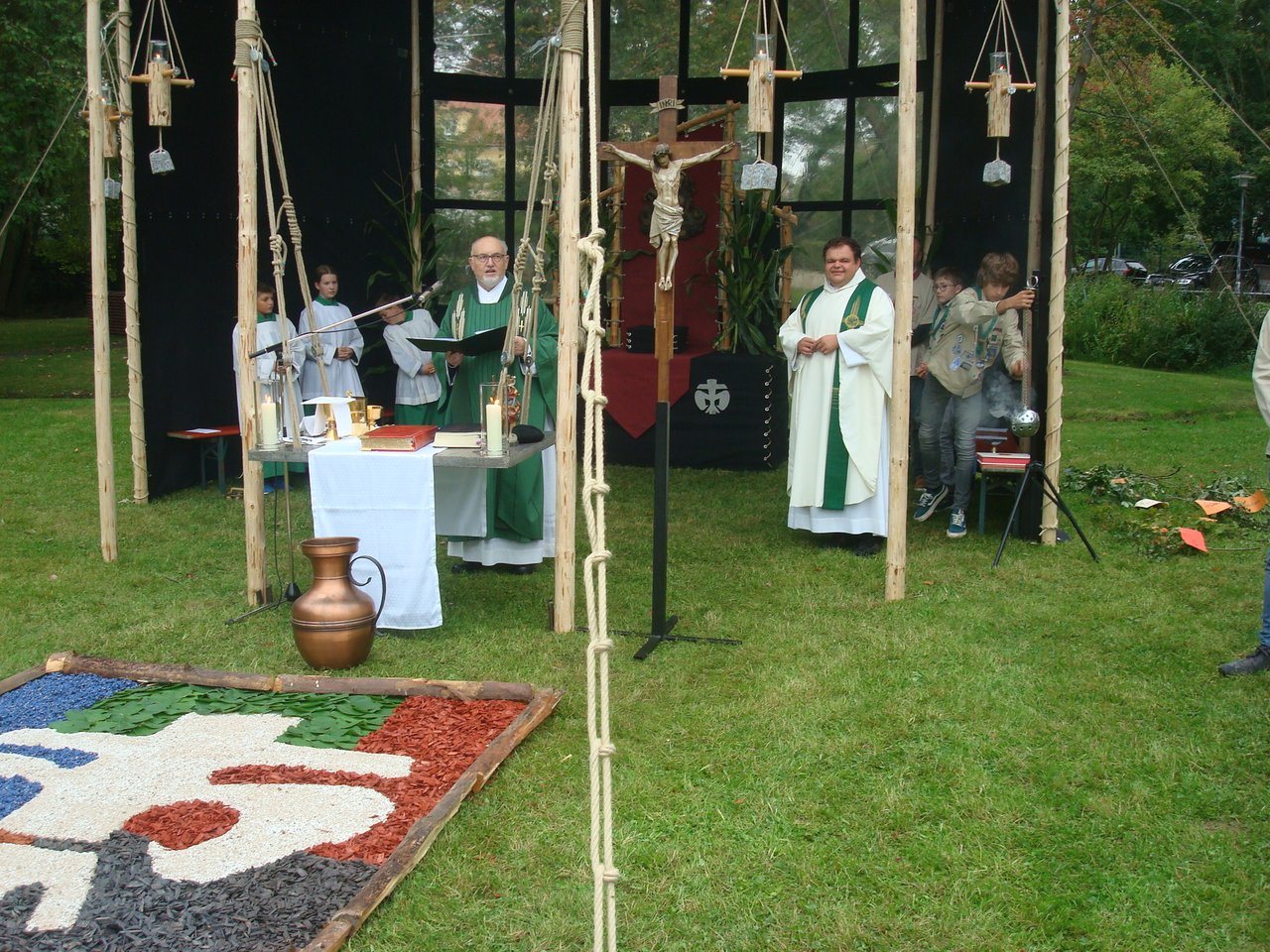 Im Altarraum sei zudem das Bild des Patrons der Pfadfinder, des heiligen Georg, aufgestellt. Es zeige den „Drachentöter“, was bedeute, dass er das Böse verhindern solle. Auch ein Bild des heiligen Christophorus sei zu sehen, der Jesus über das Wasser getragen habe. Das solle aussagen, dass wir von Jesus begleitet werden.