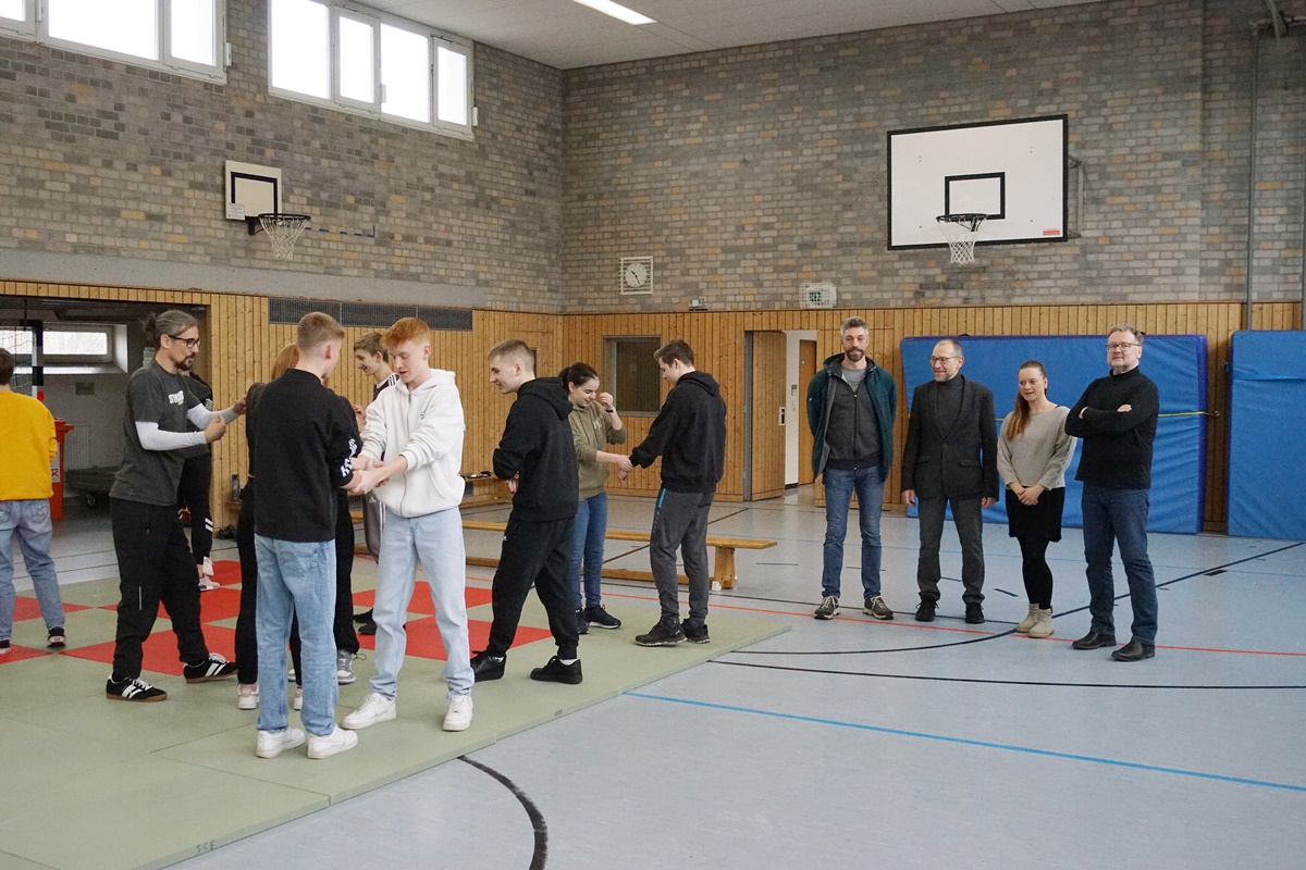 Auf den Matten in der Schulturnhalle zeigte der Schüler- und Jugendtrainer für Kampfsport, Gewaltprävention und Selbstverteidigung den verschiedenen Klassen, welche Möglichkeiten man hat, sich gegen Aggressoren zu verteidigen. „Das oberste Ziel sollte sein, Gefahren- und Gewaltsituationen vorzubeugen“, so der Trainer. „Wenn man etwas machen muss, ist es eigentlich schon zu spät. Vorausschauend denken und versuchen, in solche Situationen erst gar nicht reinzukommen“.