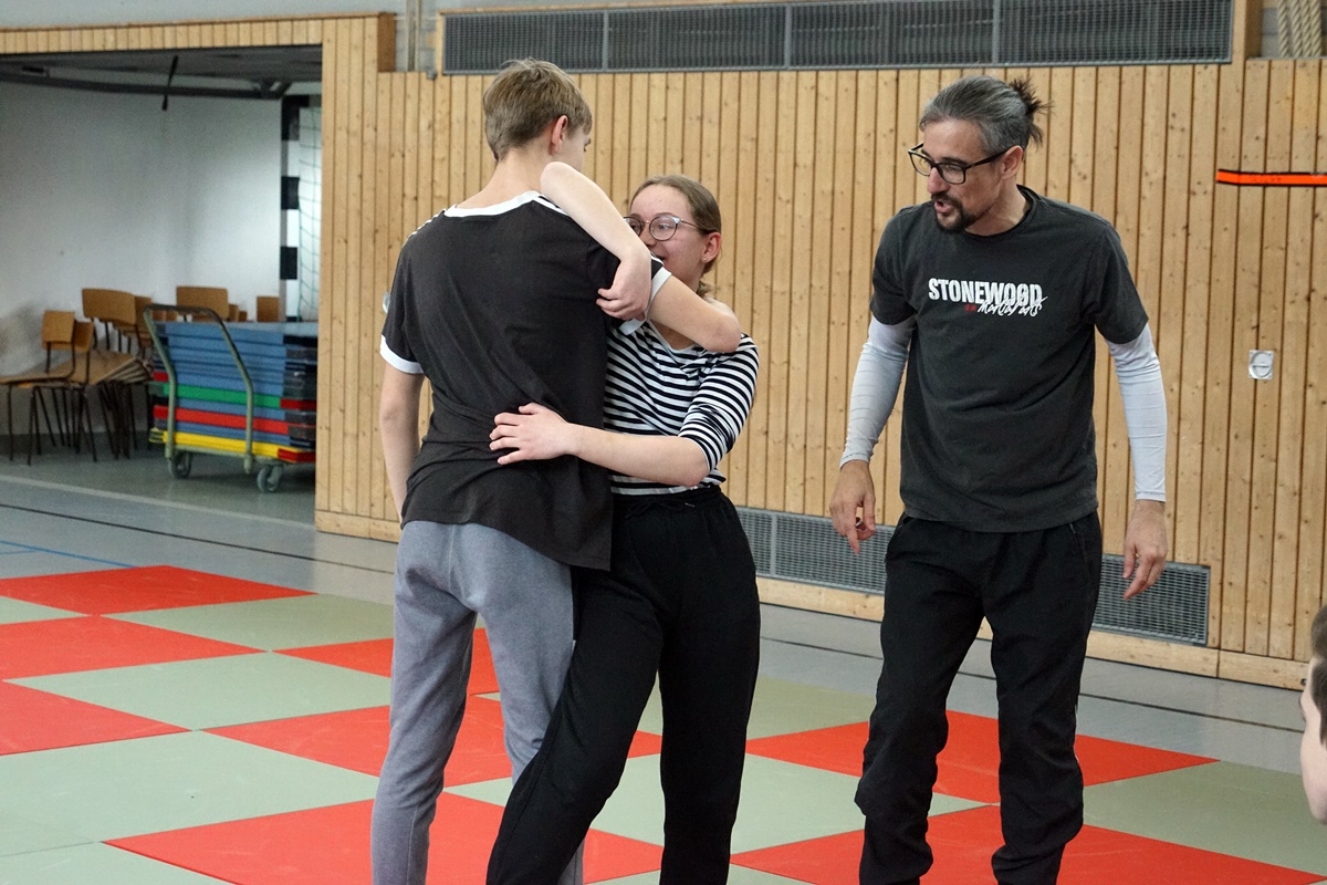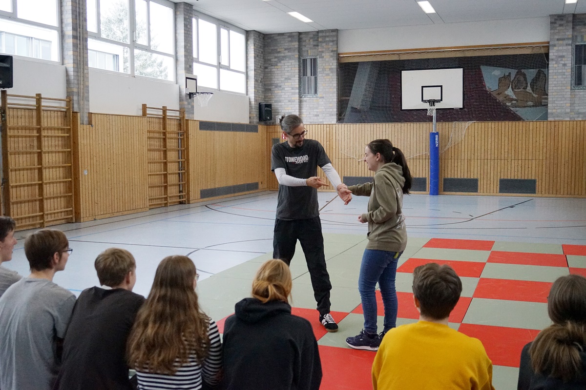 Dies alles waren zu Beginn des zwei Unterrichtsstunden dauernden Unterrichts die ersten Ansatzpunkte, die die Schülerinnen und Schüler zu hören bekamen. So versuchte er, an praktischen Situationen aufzuzeigen, was man gegen eine aggressive Person zu Beginn auch verbal unternehmen kann. „Erst in diesem Moment, wo ich überhaupt nichts mehr anderes machen kann, sollte es in körperlicher Selbstverteidigung hinauslaufen“, so Andreas Fachtan. Die Übungen waren so aufgebaut, dass der Trainer von der Distanz über Sprache und Mimik bis hin zur körperlichen Verteidigung, den Teilnehmern dies aufzeigte. „Die körperliche Verteidigung sollte das letzte sein, was man anwenden sollte“, so Fachtan.