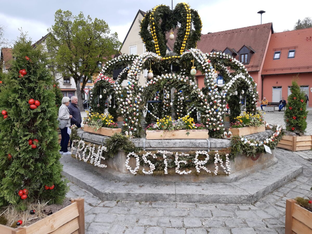 Zur Mittagszeit kehrte die Gruppe im Gasthof Schlossblick in Mostviel ein, wo sie sich für die weiteren Stationen der Reise stärkten. Der nächste Halt war Heiligenstadt, wo ein weiterer prachtvoller Osterbrunnen besichtigt wurde. Den Abschluss der Fahrt bildete ein Besuch in Gößweinstein. Hier hatten die Teilnehmer die Möglichkeit, in einem Café einzukehren und die dortige Wallfahrtsbasilika zu besichtigen.