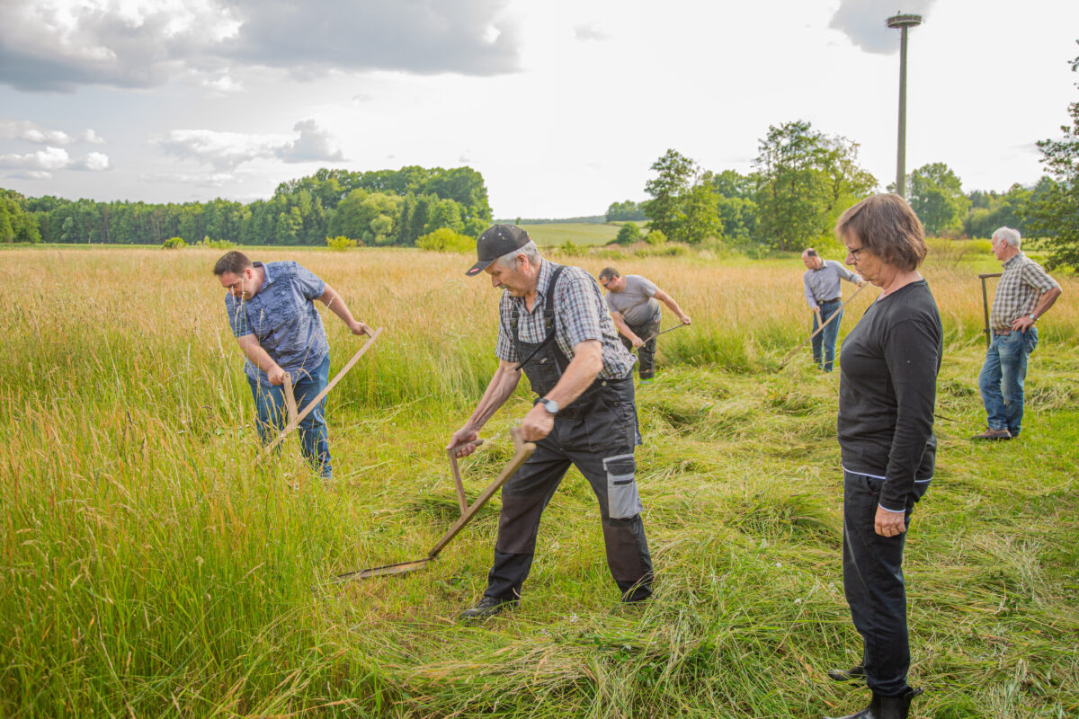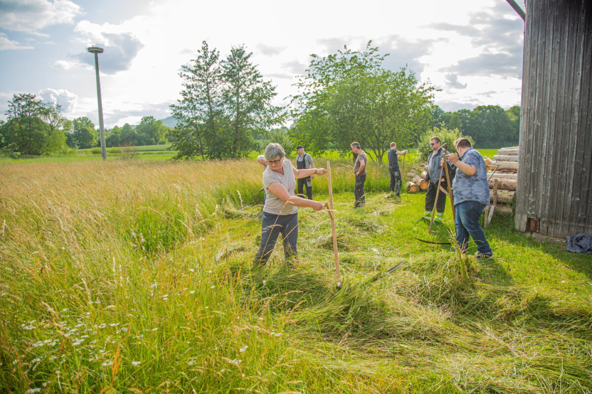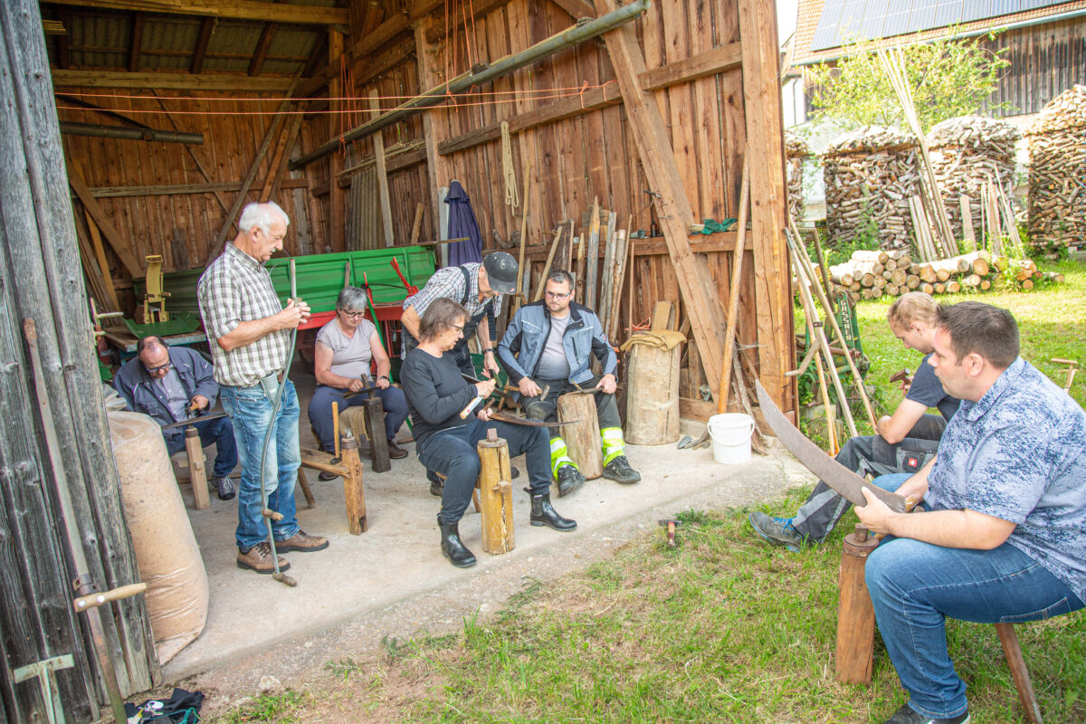 Jonas Zeitler aus Weha erinnerte sich dabei an seinen verstorbenen Großvater, den „Kimmerl Sepp“, der das Dengel und das Mähen mit der Sense noch perfekt beherrscht hat. Heute liegen die Sensen, mehrere an der Zahl, auf dem Dachboden, wobei die eine oder andere wohl schon beide Weltkriege erlebt haben durfte, aber seit vielen Jahren nie mehr genutzt wurden – heute übernimmt die Arbeit meist die Motorsense oder das Kreiselmähwerk. „Wenn mir das schon eher jemand gezeigt hätte“, sagt er später, „hätte ich öfter mal die Sense genommen. Es ist eigentlich ganz einfach, wenn man weiß, wie’s geht.“ Dass das Mähen früher aber oft im Morgengrauen begann, damit das Gras noch die richtige Feuchtigkeit hatte, erzählte Wopperer ebenfalls – und damit auch, dass es harte, aber gemeinschaftliche Arbeit war. „Um drei Uhr früh aufstehen, raus auf die Wiese, um acht schon wieder fertig – und dann erst den Stall machen.“