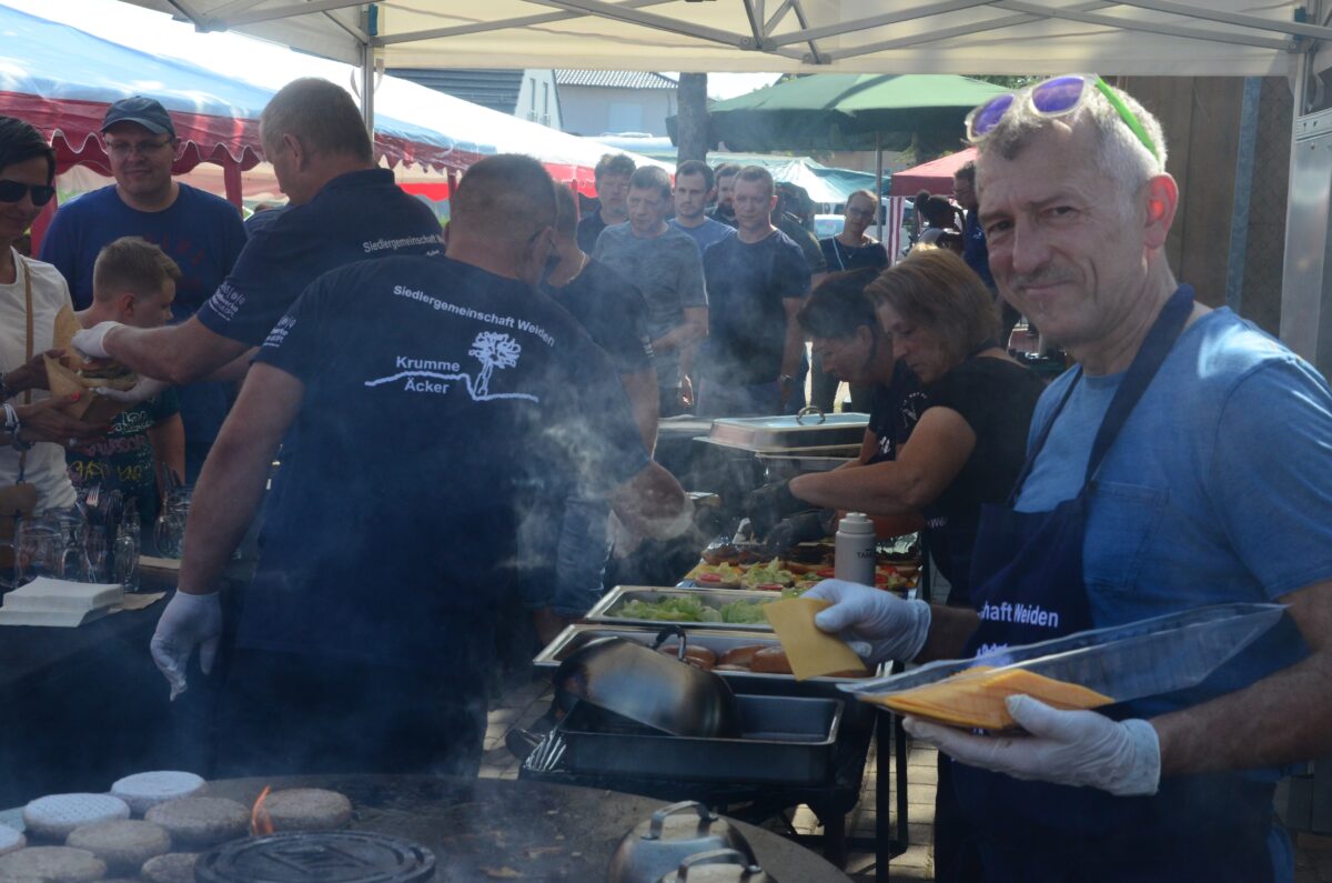 Am Sonntag feierte die Siedlergemeinschaft Krumme Äcker in der Westfalenstraße ihr Siedlerfest. Vom Startschuss weg war das nach allen Seiten offene Zelt gut gefüllt. Viele Gäste waren gekommen, um ein paar unbeschwerte Stunden unter netten Nachbarn zu verbringen. Für Oberbürgermeister Jens Meyer war es mehr als ein Pflichttermin. “Der steht schon seit Jahrzehnten bei mir im Terminkalender”, schummelte er. “Ich wohne ja selbst hier in der Siedlung. Ich fühle mich hier superwohl.” Das Grillfleisch sei legendär und das Fest blendend organisiert von einer top motivierten Mannschaft.