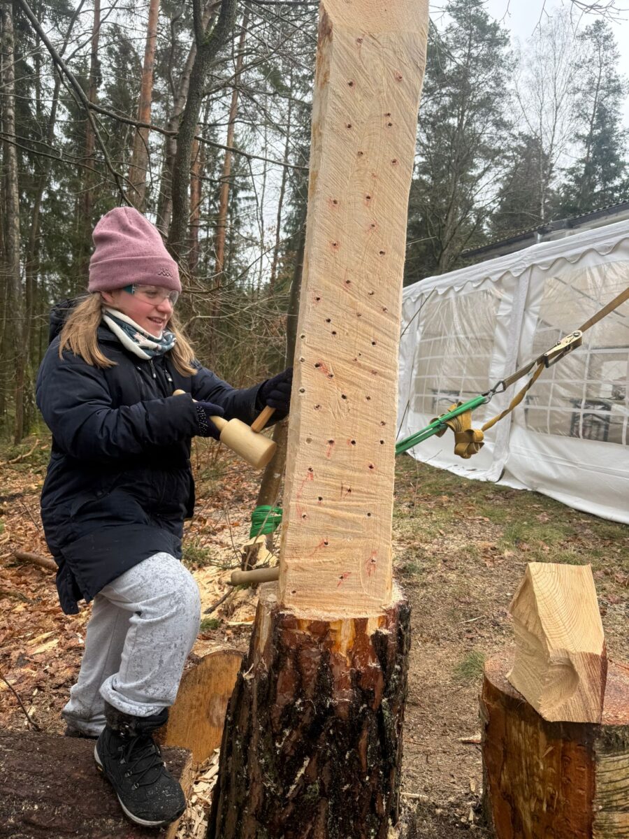 Mit dem Projekt „Hüter*in des Waldes – Ein Skulpturenpark entsteht“ ist es der LearningCampus gGmbH gelungen, Kunst und Jugendarbeit kreativ und nachhaltig zu verbinden. Eine Kreativwoche lang waren die Teilnehmenden aktiv, holten sich Inspirationen aus der Natur und professionelle Anleitung von zwei Bildhauer:innen, die das Projekt begleiteten. Tag für Tag wurde geschnitzt, geklopft und kreativ gearbeitet.