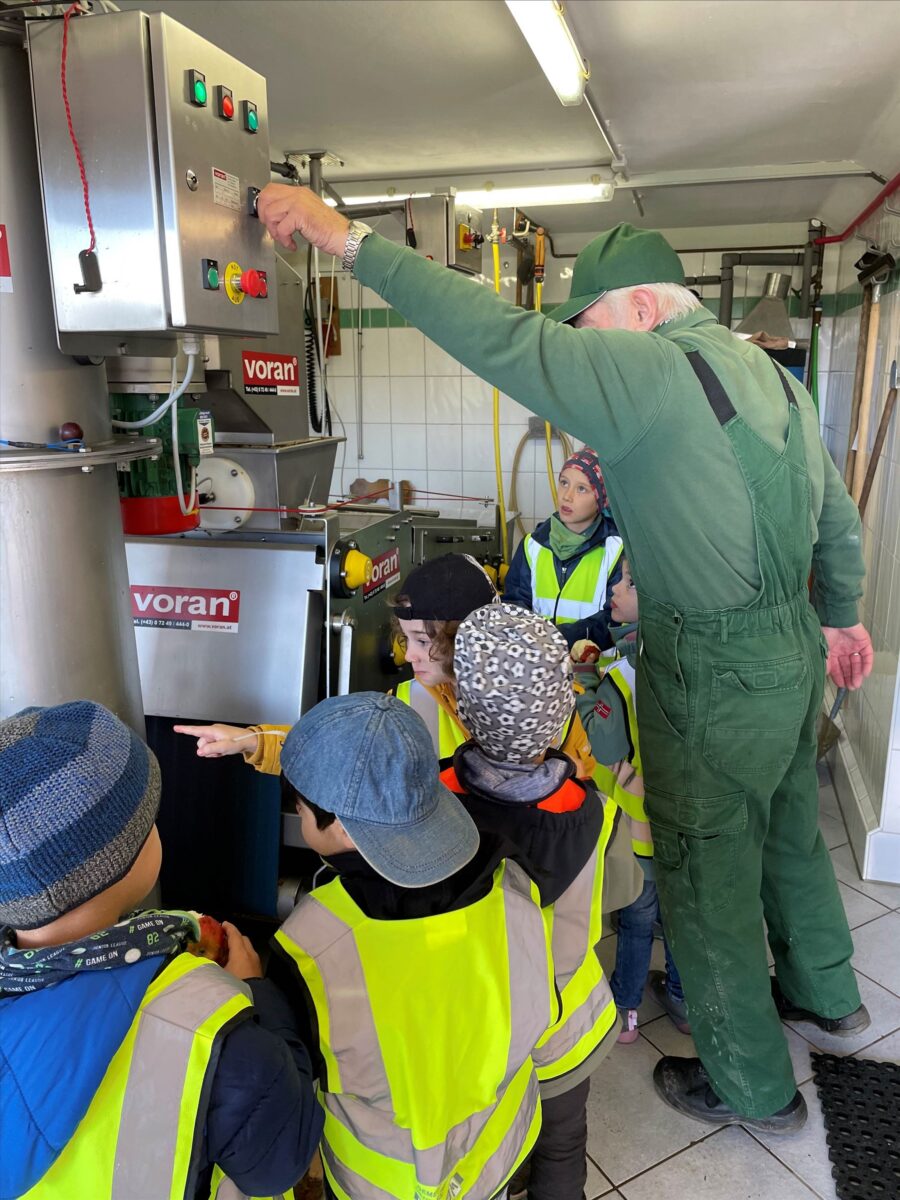 Gemeinsam fanden die Kinder heraus, wie aus den Äpfeln der leckere Saft entsteht. Am Vereinsgelände ankommen, gab es viele Äpfel und die große Obstpresse zu bestaunen. Die Vorsitzende Maria Frauenholz erklärte den Kindern, dass die Reste der gepressten Äpfel “Trester” heißen und auch diese wiederverwertet werden.