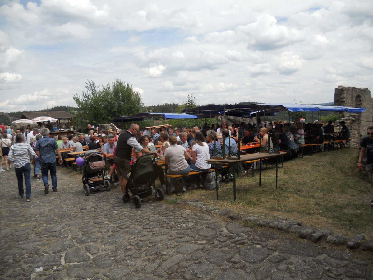 Einer der Höhepunkte war sicherlich der Auftritt der Burgwehr. Die ließ es beim Salutschießen und auch immer wieder dazwischen ordentlich krachen! Durch die Kehlen der zahlreichen Besucher aus nah und fern floss herrlich frischer Gerstensaft, natürlich auch alkoholfreie Getränke. Auch auf der Burg gab es reichlich zu essen. Das ganze Fest wurde abgerundet durch eine kleine Raterunde.