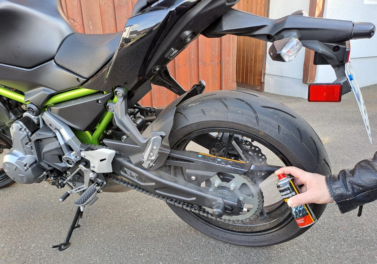 Eine Antriebskette ist auf Spannung (laut Bedienungsanleitung) und nach Reinigung auf Verschleiß zu kontrollieren, bevor sie mit Kettenfett oder -spray geschmiert wird. Bei älteren Maschinen verdient die oft noch offene Kardanwelle und bei neueren Bikes (wie Harley Davidson) der Antriebs-Zahnriemen einen prüfenden Blick. Für Touren mit Gepäck lässt sich die mögliche Zuladung in der Zulassungsbescheinigung Teil 1 durch Abziehen der Leermasse (Ziffer G) vom zulässigen Gesamtgewicht (Ziffer F.1) ermitteln. Wird das Bike voll beladen, müssen eventuell die hinteren Federn härter eingestellt, die Scheinwerfereinstellung nachjustiert und der Reifendruck erhöht werden.
