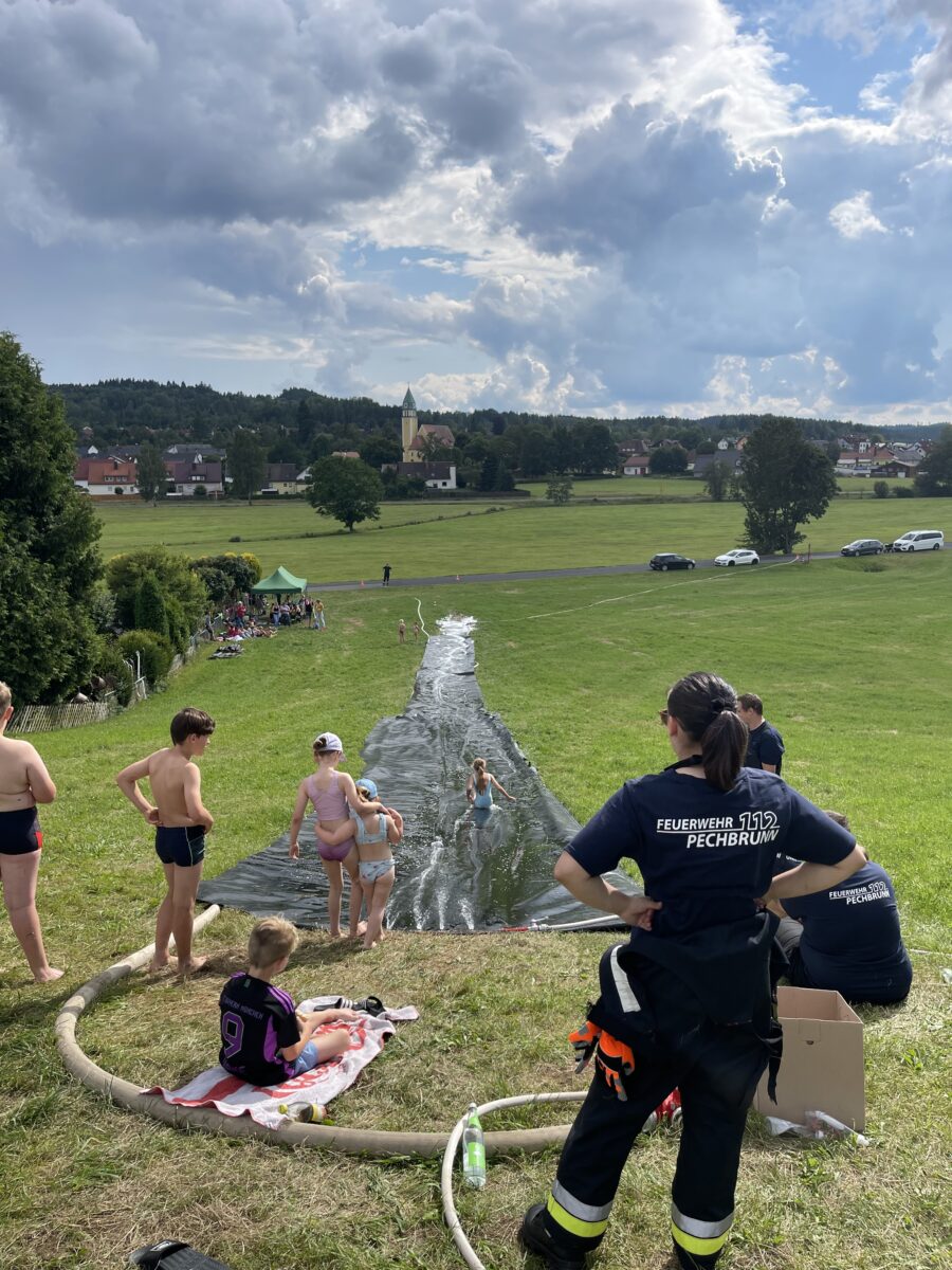 Die Gemeinde Pechbrunn erlebte im Rahmen ihres Ferienprogramms eine besondere Attraktion für Kinder. Die Freiwillige Feuerwehr Pechbrunn organisierte eine “rasante Rutschpartie” für die jungen Gemeindemitglieder. Trotz vereinzelter Regenschauer am Vormittag, zeigte sich das Wetter am Nachmittag von seiner besten Seite, wodurch die Veranstaltung zu einem vollen Erfolg wurde.