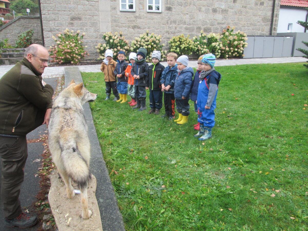 Danach durften die Kinder noch einen ausgestopften Wolf betrachten. Ranger Heiko fragte zuerst, was sie denken, welches Tier, das ist. Die Kinder antworteten mit „Fuchs“ oder „Hund“ es dauerte einige Versuche, bis die Kinder auf den „Wolf“ kamen. Dabei haben sie erfahren, dass dies eine einjährige Wölfin war, die leider von einem Auto überfahren wurde.