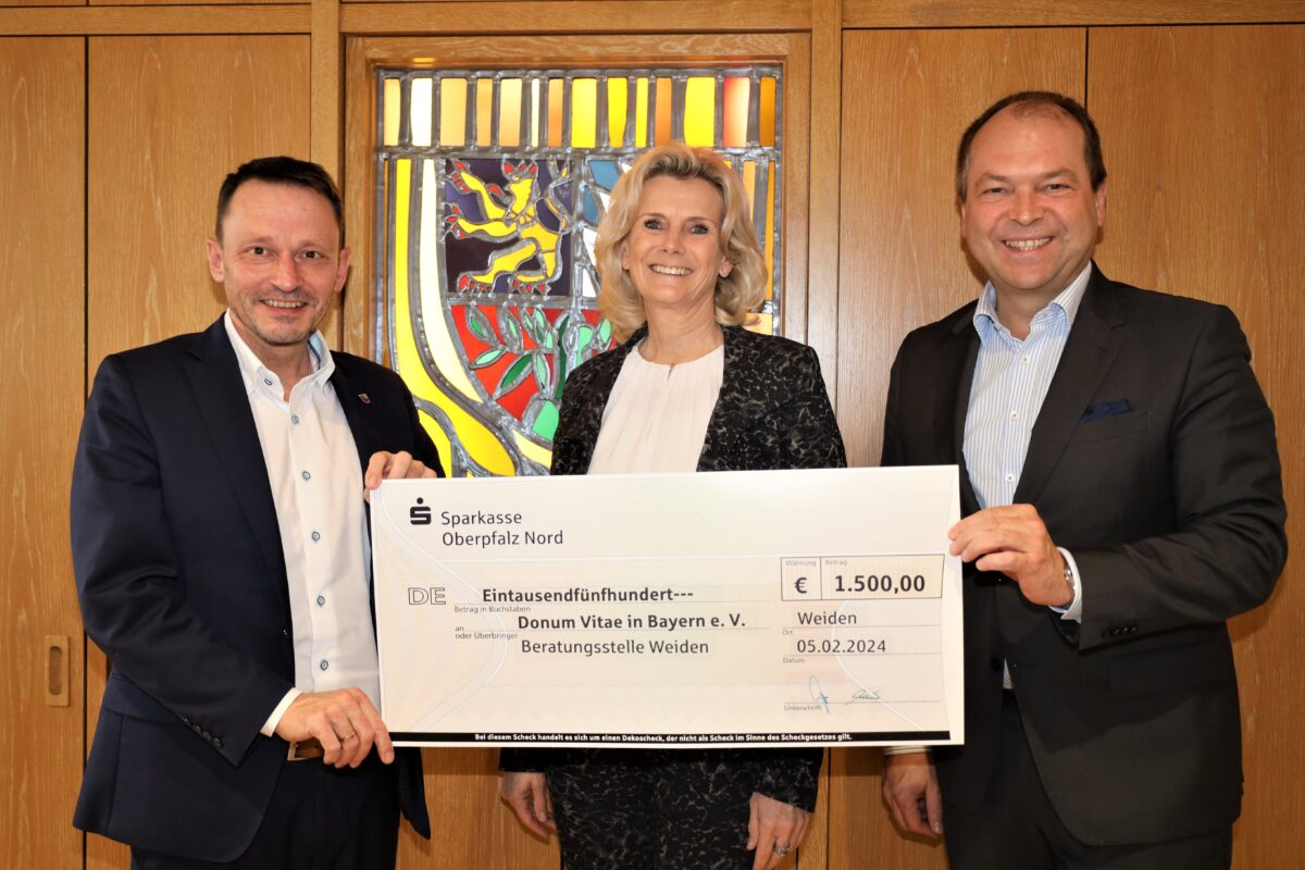 „Donum Vitae leistet einen wertvollen Beitrag für unsere Gesellschaft und verdient Unterstützung. Daher freue ich mich, dass die Sparkasse Oberpfalz Nord der Beratungsstelle erneut finanziell unter die Arme greift“, betont Oberbürgermeister Jens Meyer. Den Spendenscheck in Höhe von 1500 Euro hat Vorstandsvorsitzender Hans-Jörg Schön nun im Neuen Rathaus überreicht.