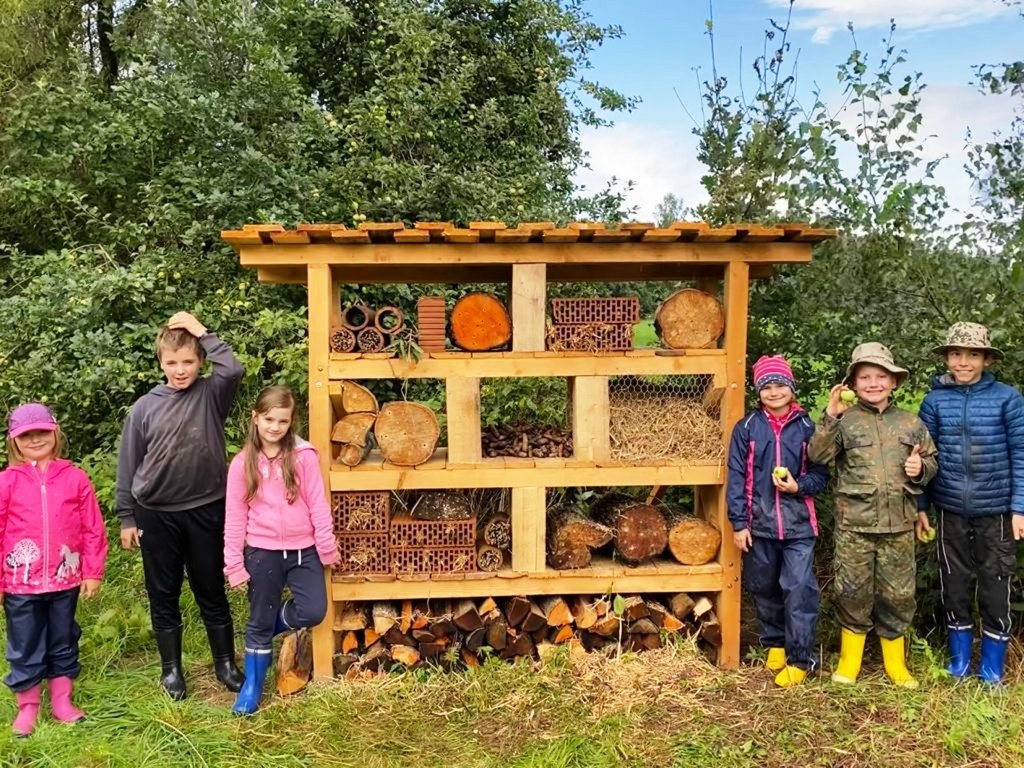 Hierfür bohrten die Mädchen und Buben mit einem Akkubohrer verschieden große Löcher in Baumstämme. Danach bestückten sie das Insektenhotel mit allerlei „Mobiliar“ in Form von Baumstammabschnitten, Stroh, Schilf, Totholz, Fichtenzapfen und Ziegelsteinen. Einen Großteil der Füllmaterialien hatten die Kinder selbst im Wald am Grünbach gesammelt – in direkter Nachbarschaft zum Streuobstwiesen- und Bienenhaus-Areal der Trabitzer LBV-Gruppe, das vom Amt für ländliche Entwicklung als Vorzeigeprojekt belobigt und gefördert wurde.