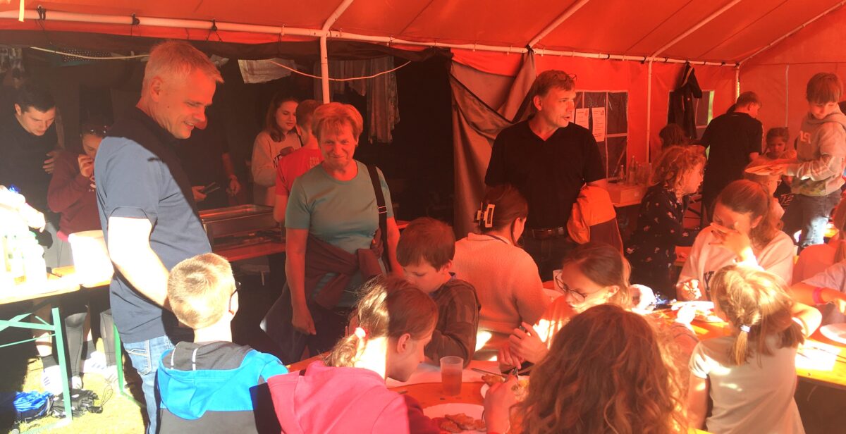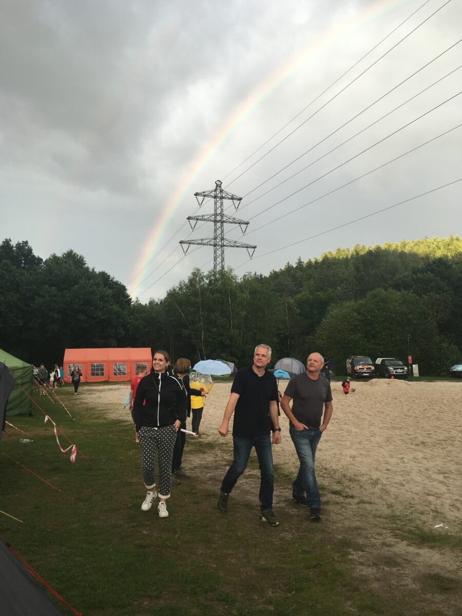 Nach dem gemeinsamen Abendessen der Spendenüberbringer mit den Kindern des Zeltlagers haben sich die Schleusen des Himmels weit geöffnet und nach einiger Zeit wurde das Essenszelt von den Wassermengen unter Wasser gesetzt. Hier hatte man kurzzeitig das Gefühl, dass man sich nicht in Hirschau, sondern in „Klein Wacken“ befindet. Die Kinder hatten trotz der Nässe viel Spaß im diesjährigen Zeltlager.