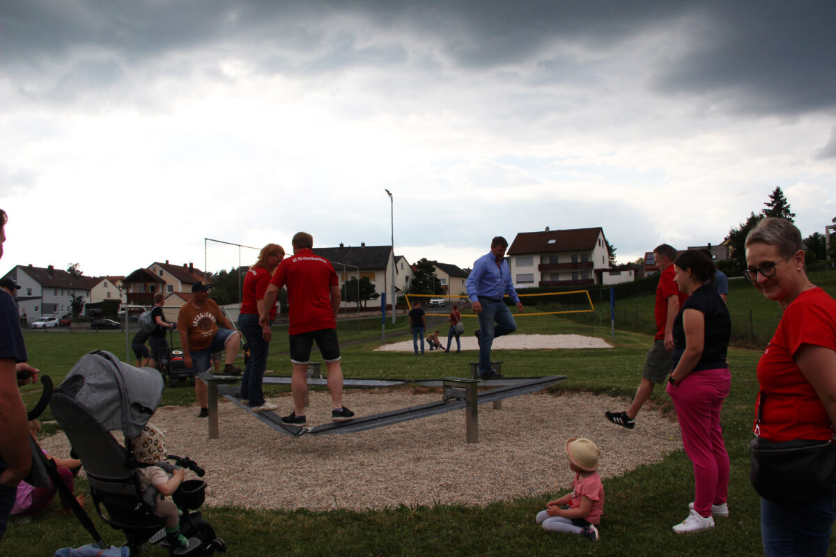 Das Highlight der offiziellen Einweihung kam jedoch erst zum Schluss, als Bürgermeister, Marktgemeinderäte sowie Vertreter des Sportclubs selbst die Geräte testeten, indem sie die Wippe in Beschlag nahmen und sie vor den Augen der Eltern und Kinder auf ihre Tauglichkeit untersuchten. Diese Aktion sorgte vor allem bei den Eltern für große Heiterkeit und rundete die gelungene Einweihung angemessen ab.